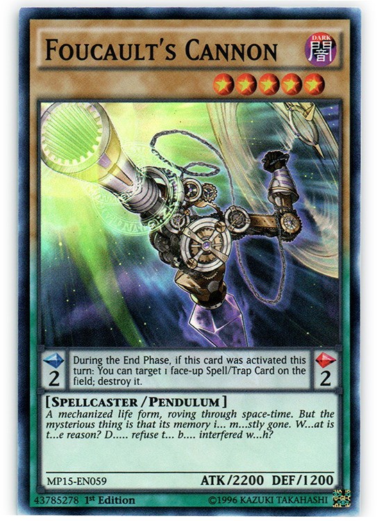 Foucault's Cannon - MP15-EN059 - Super Rare - 1st Edition Image is a stock photo of the card. You will receive the card in Lightly Played condition Condition: Lightly Played ATK/DEF : 2200/1200 Ability : Attack #1 : Attack #2 : Attack #3 : Attribute : Dark Card Number : MP15-EN059 Card Rules : Card Text : Pendulum Effect During the End Phase, if this card was activated this turn: You can target 1 face-up Spell/Trap Card on the field; destroy it. Card Type : NormalPendulum Monster Edition : 1st Finish : HP : Illustrator : Level : 5 Manufacturer : Monster Type : Spellcaster Name : Foucault's Cannon Passcode : 43785278 Pendulum Scale : 2 Rarity : Super Rare Resistance : Retreat Cost : Set : 2018 Mega Tin Pack Stage : Weakness : Be sure to visit our store for a wide selection of your favorite cards! We are running specials RIGHT NOW!! Shipping Options: ~Ships in a regular white envelope with a stamp for FREE! (THERE IS NO TRACKING INFORMATION AVAILABLE FOR THE ABOVE METHOD. SHIPPING TIME IS 4-10 BUSINESS DAYS) ~Shipments are handled same or next business day. ~ FREE SHIPPING for each additional card, so shop around our store!