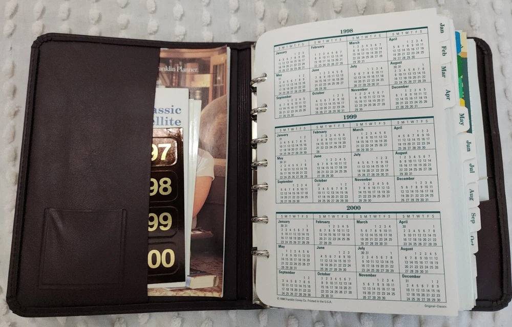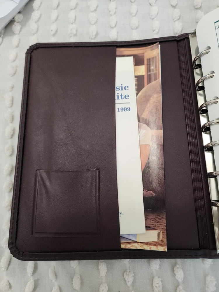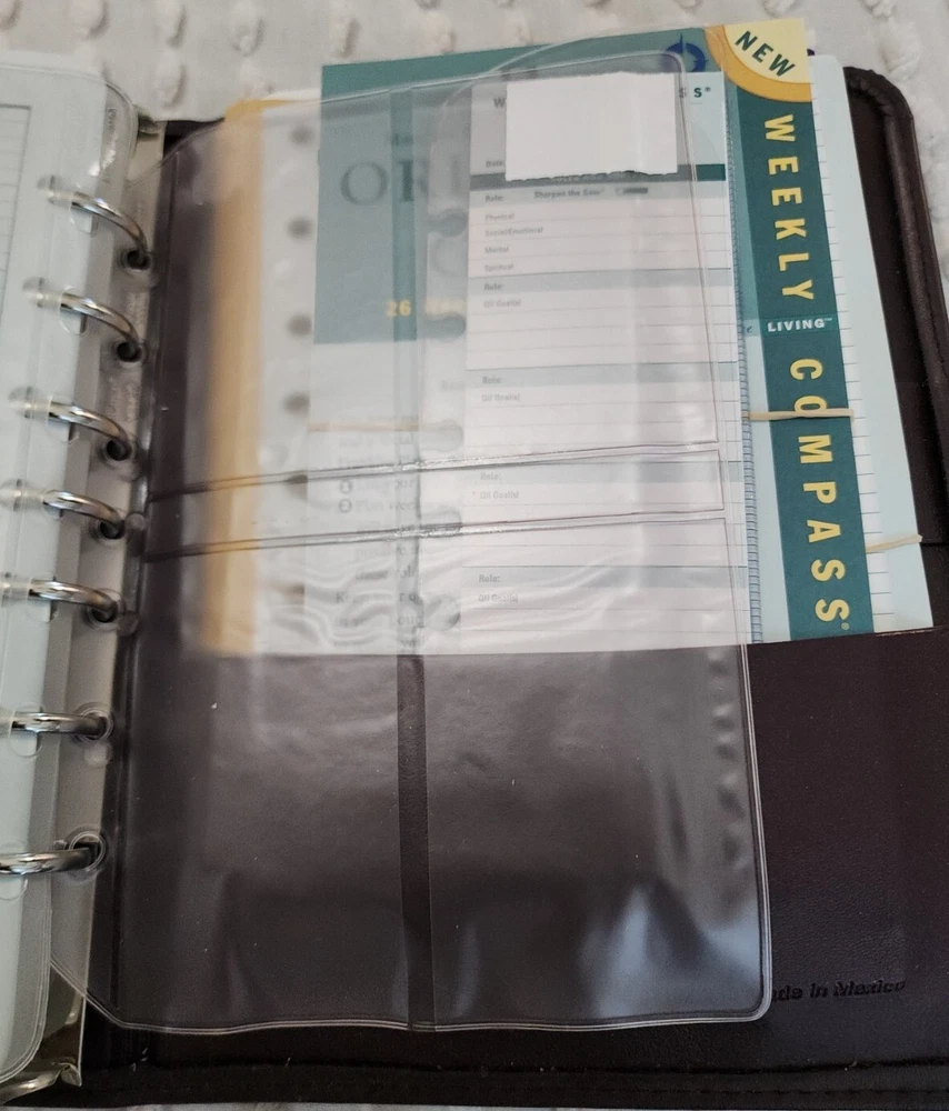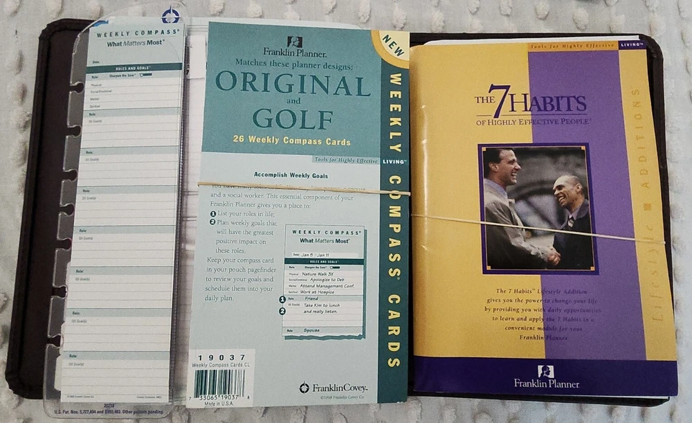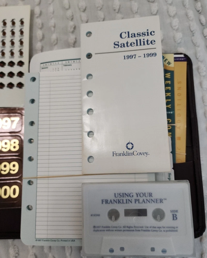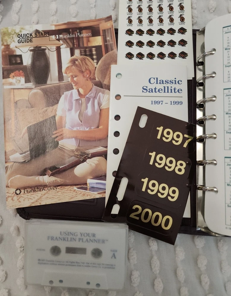 Classic Faux Leather Organizing Planning Binder, with front and back internal pockets and 7 Rings Plus Franklin Covey 7x9 Planner Using your Franklin Planner Audio Cassette tape and Inserts including 7 Habits for Highly Effective People living lifestyle additions, business card holder, zip pencil holder, classic satellite book, Quickstart guide, Alphabetical address tabs and pages, Weekly compass, extra shortened note pages, 2 sets of 26 weekly compass cards. As well as 1999 year daily and task list planner pages, expenses pages, record of events pages for months April through November inserts may vary by month. December through March Tabs are included but no pages behind them.
