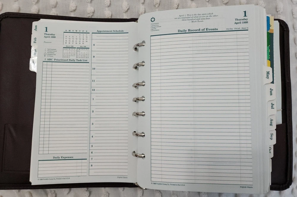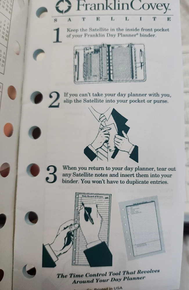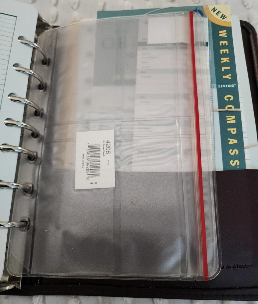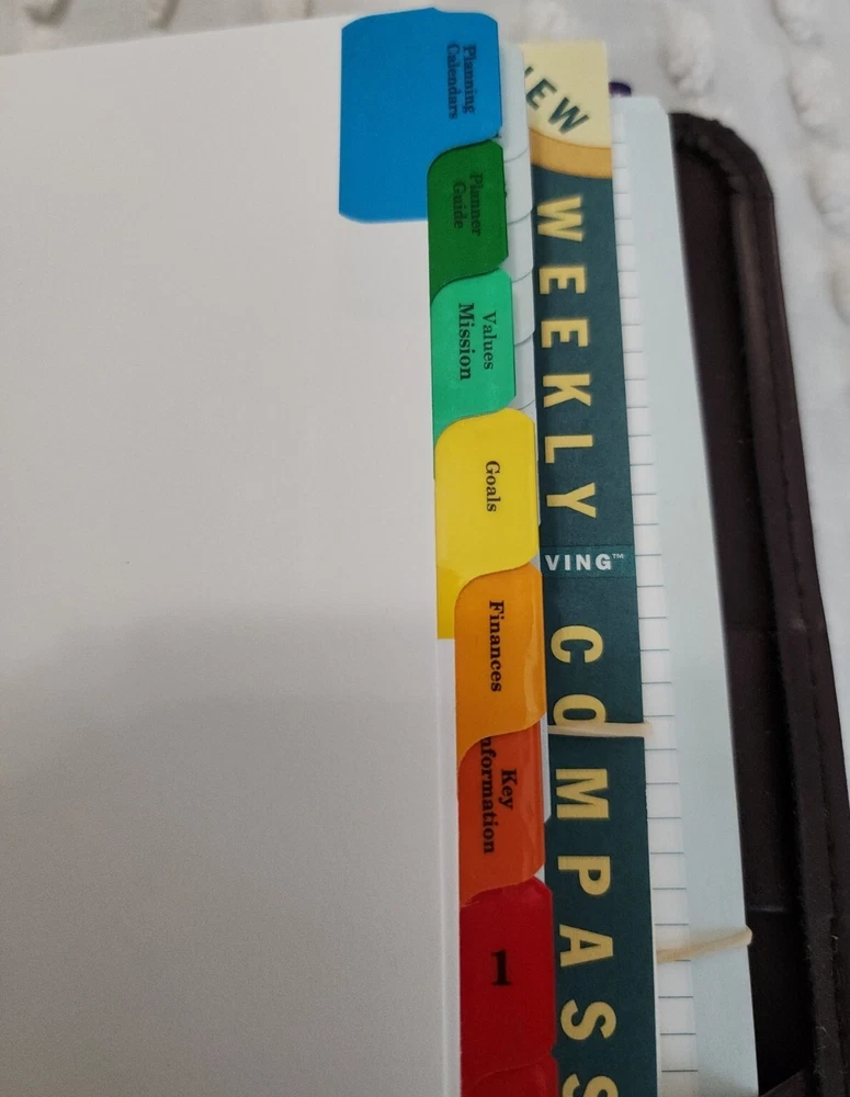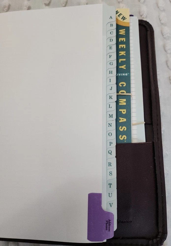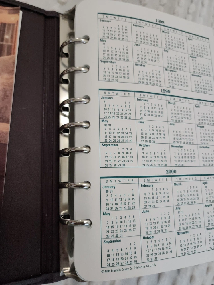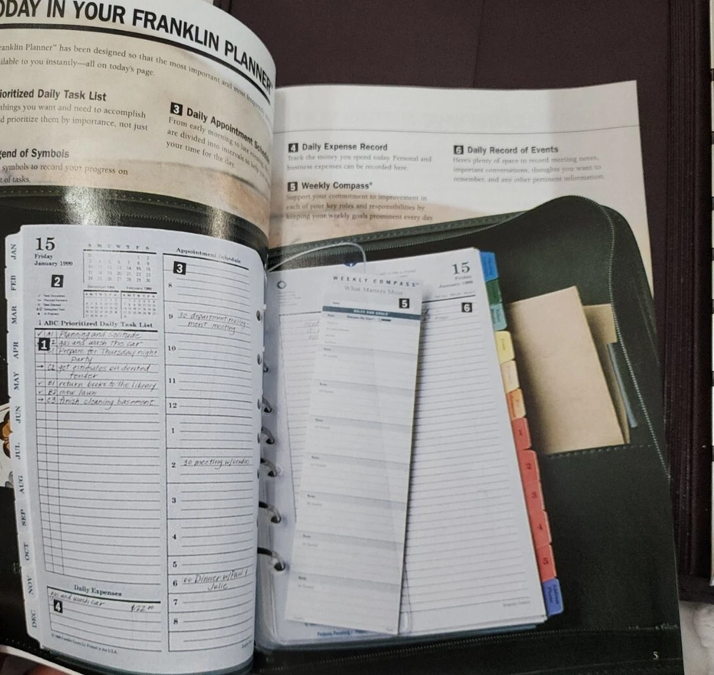 Classic Faux Leather Organizing Planning Binder, with front and back internal pockets and 7 Rings Plus Franklin Covey 7x9 Planner Using your Franklin Planner Audio Cassette tape and Inserts including 7 Habits for Highly Effective People living lifestyle additions, business card holder, zip pencil holder, classic satellite book, Quickstart guide, Alphabetical address tabs and pages, Weekly compass, extra shortened note pages, 2 sets of 26 weekly compass cards. As well as 1999 year daily and task list planner pages, expenses pages, record of events pages for months April through November inserts may vary by month. December through March Tabs are included but no pages behind them.