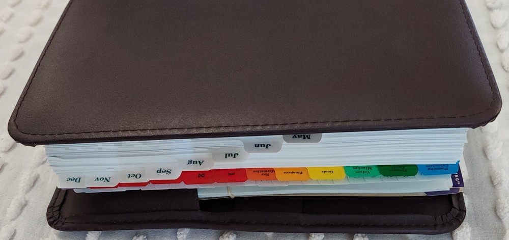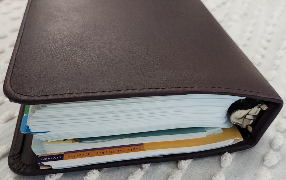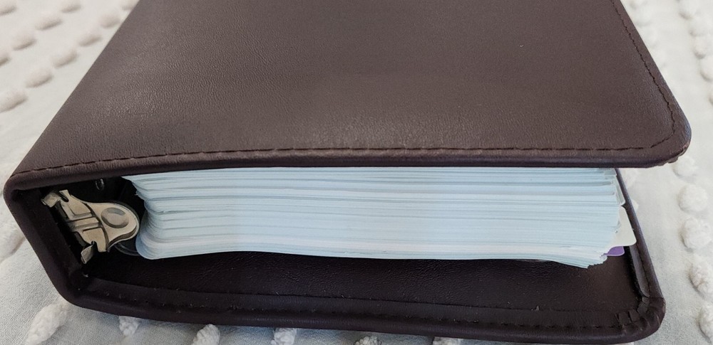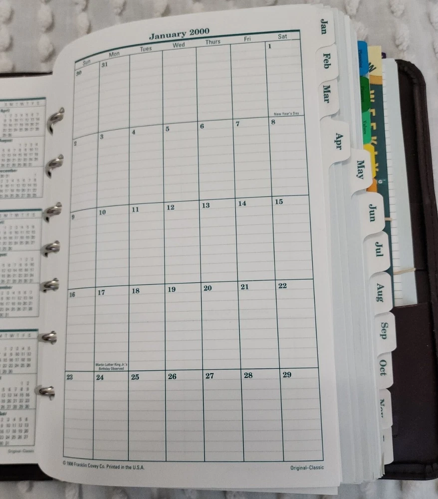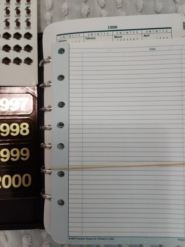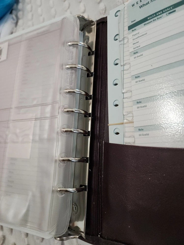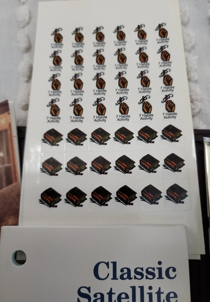 Classic Faux Leather Organizing Planning Binder, with front and back internal pockets and 7 Rings Plus Franklin Covey 7x9 Planner Using your Franklin Planner Audio Cassette tape and Inserts including 7 Habits for Highly Effective People living lifestyle additions, business card holder, zip pencil holder, classic satellite book, Quickstart guide, Alphabetical address tabs and pages, Weekly compass, extra shortened note pages, 2 sets of 26 weekly compass cards. As well as 1999 year daily and task list planner pages, expenses pages, record of events pages for months April through November inserts may vary by month. December through March Tabs are included but no pages behind them.