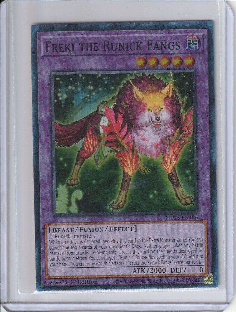 The product is a Super Rare "Freki the Runick Fangs" card from the Yu-Gi-Oh! TCG 25th Anniversary Tin: Dueling Heroes Mega Pack. It is a Dark Beast-type card with 2000 Attack/Power and 0 Defense/Toughness. This 1st Edition English card is made of Card Stock and features an Effect Fusion ability, making it suitable for players aged 6 and above. Manufactured by Konami in the United States, this collectible card is a valuable addition for fans of the game. Personal Collection in Penny Sleeves, along with top loader, any questions, feel free to ask.