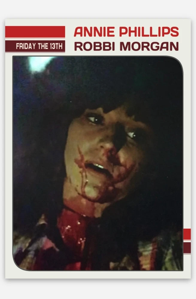Robbi Morgan - Annie Phillips Friday the 13th (1980) CUSTOM Trading card. This card is part of a 5 card set. Winner pays $4.00 S/H within the US. International is extra. Please check the other listing to see the other cards in the set and AUTOGRAPHED cards for sale.