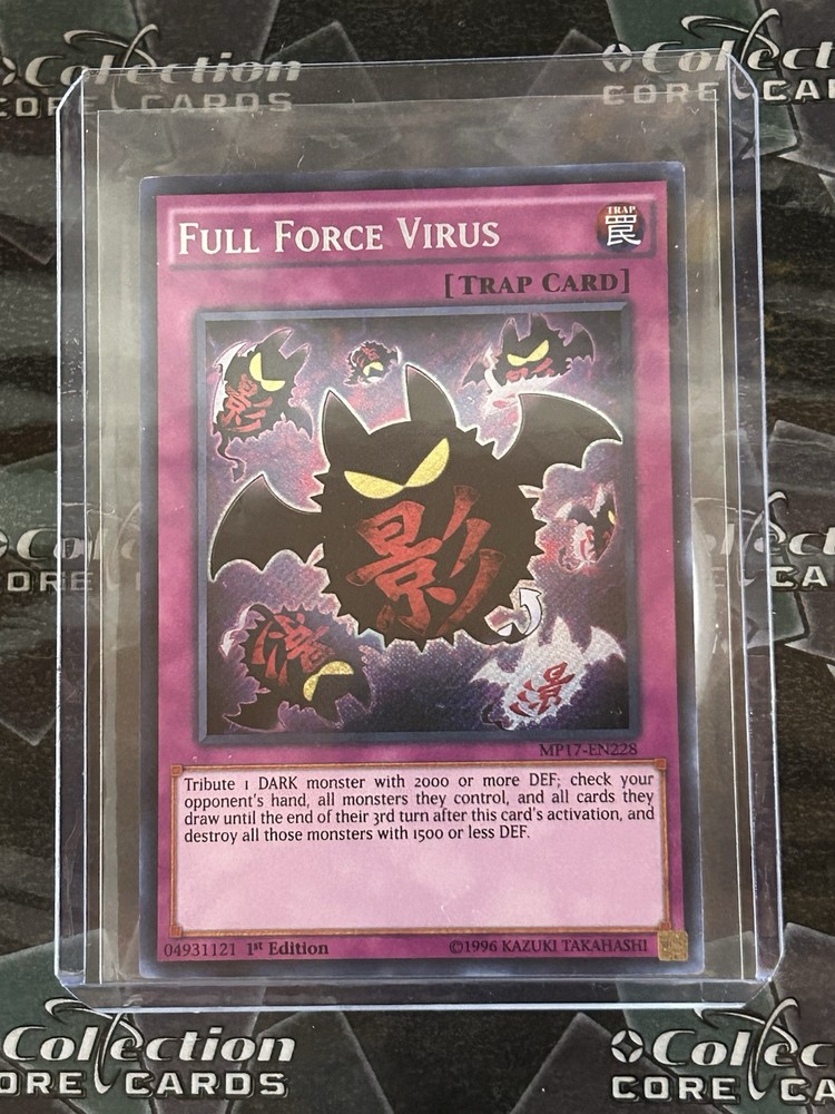 *Toploader/sleeve included and daily shipping in secure packaging.* Full Force Virus MP17-EN228 is a Secret Rare card from the 2017 Mega-Tins Mega Pack. It is a Trap-Normal card with an English language print and a 1st Edition feature. The card is manufactured by Konami and belongs to the Yu-Gi-Oh! TCG game.