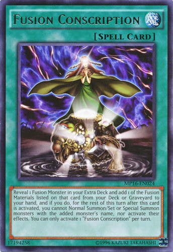 Please, carefully read the following: Image shown is a stock photo and does not reflect the actual card you will be receiving. Please refer to the condition guide below, the title and item description for what you will be receiving. Please also be aware that due to plastic shortages, orders may not always come in a plastic toploader but will always be protected as much as possible to prevent damage. You will receive 1x Fusion Conscription - MP16-EN024 - Rare - Unlimited Edition - Condition: Near Mint Please refer to the Title and Item Description above for the item being purchased. Delivery delays: Deliveries may not always fall within the estimated delivery dates when shipping outside of Canada and USA. Many factors may contribute to delays in delivering the package such as weather and customs. Please note that delivery to international locations may take up to 8 weeks to arrive . We always ship out orders within 1 business day and after dropping off with the post office, delivery times are out of our control. Feedback: We will always leave positive feedback for you and we ask if you can do the same for us. If there is any reason why the transaction was not up to your expectations, please message us before leaving feedback so we can address the issue. Combined shipping: To receive a combined shipping quote, please make sure that you commit to purchasing on ebay.ca . This allows us to send you a combined shipping invoice before payment. Shipping within the USA (6-10 Business days): FREE! Shipping within Canada (3-8 Business days): FREE! Shipping and handling delay: We aim to ship all orders within 1 business day. We do not ship on weekends and holidays. Condition Guide: We do not sell any cards that are in MINT condition, the best condition that we offer is near mint. Near Mint (NM) - Cards in Near Mint condition show minimal to no wear from shuffling, play or handling and can have a nearly unmarked surface, crisp corners and unblemished edges outside of a few minimal flaws. A Near Mint card may have a tiny edge nick or a tiny scratch or two, but overall look nearly unplayed with no major defects or flaws. Lightly Played (LP) - Cards in Lightly Played condition may have minor border or corner wear or even just slight scuffs or scratches. There are no major defects such as water damage, bends or issues with the structural integrity of the card. Noticeable imperfections are okay, but none should be too severe or at too high a volume. Moderately Played (MP) - Cards in Moderately Played condition exhibit condition issues visible at a casual glance. Cards in Moderately Played condition can have border wear, corner wear, scratching or scuffing, creases or whitening, minor dirt buildup or any combination of mild examples of these marks. A Moderately Played card may have some form of a more major marking, such as spot water damage or creasing that doesnʼt affect card integrity, but not in combination with other issues such as scratches, scuffs or border/edge wear and not impacting a large area of the card. Heavily Played (HP) - Cards in Heavily Played condition show a severe amount of wear. Heavily Played condition can include cards that have major creasing, major whitening, major border wear or any combination of those flaws. (These flaws cannot prevent the card from being tournament playable when sleeved.) Damaged - Cards in Damaged condition can exhibit a tear, bend or crease that may make the card illegal for tournament play, even in a sleeve. Cards in Damaged condition may have extreme border wear, extreme corner wear, heavy scratching or scuffing, folds, creases or tears or other damages that impacts the structural integrity of the card.