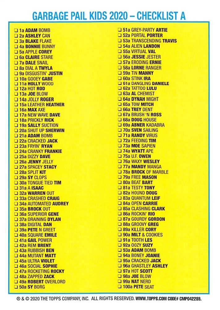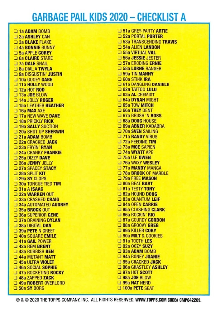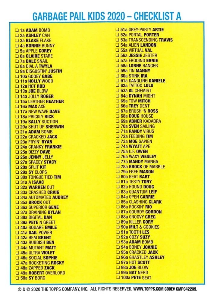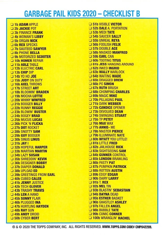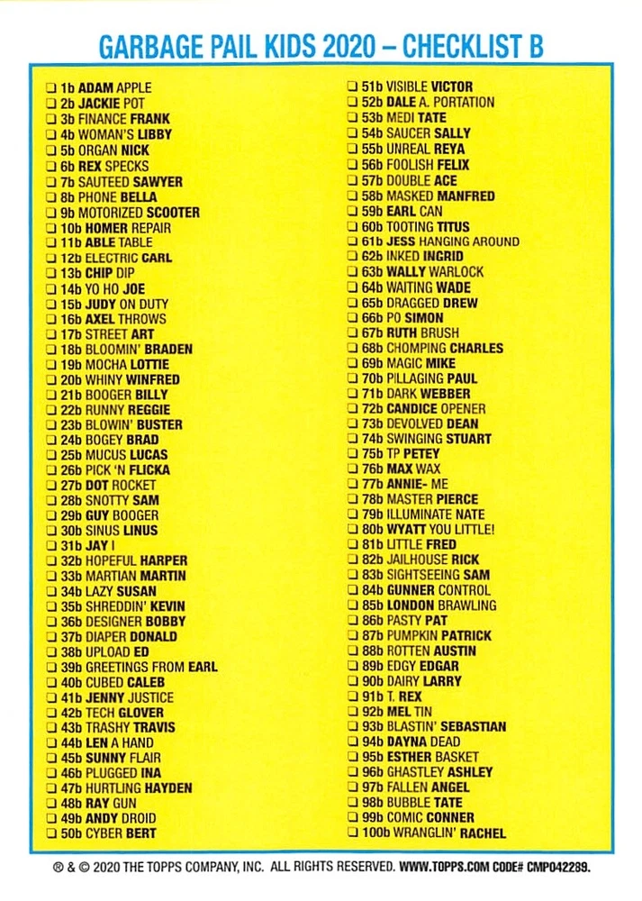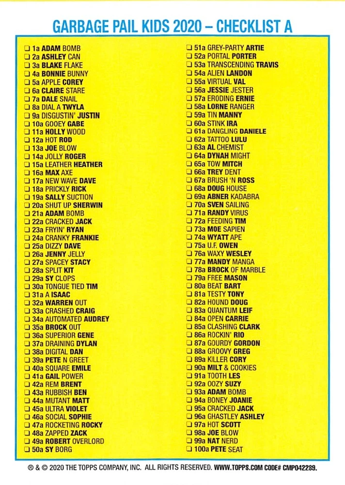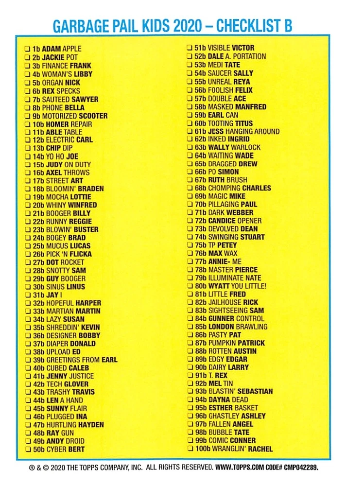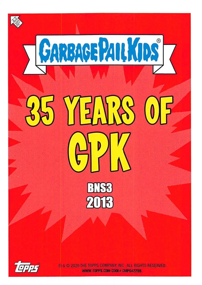 This listing is for your choice of any available 2020 Topps Garbage Pail Kids "35th Anniversary" green border parallel card from the drop-down menu above. Photos show front and backside of each card, be sure to scroll sideways to view front and backside photos! Check out my other listings for more single parallels from this same set. Any questions? Please ask before buying. International "USPS First Class Mail" will not include a tracking number for this item, if you would like a tracking number please choose the "eBay International Standard Shipping" option when you check out. Any questions? Just ask! As with all of my "pick-a-card" listings, I will be shipping with "eBay Standard Envelope". The rules of this envelope state that it cannot be too thick, so please expect your order to be packaged as follows: 1 to 6 cards will be slid into a single sleeve, the sleeve will then be slid inside of a semi-rigid Card-Saver. 6 to 12 cards will be slid into a double sleeve, 13 to 18 cards into a triple sleeve, 19 to 24 cards into a quadruple sleeve(up to six cards per sleeve). The double, triple and quadruple sleeve shipping will not have the Card-Saver. If you buy more than 1 card and want it packaged with more than 1 Card-Saver(or 1 sleeve per card), I kindly ask that you contact me before purchasing to be sure that this is possible to have it done with the stated shipping charge, or if additional shipping would be required. If you do not contact me, then you can expect to receive your order packaged as I have explained here. Please do not expect rigid top-loaders to be included, I don't normally keep a lot of them in stock, but if you message me prior to ordering I will be able to see if I have any that can be included with your order - additional shipping may be required. In order to get free combined shipping from this and any of my other "pick-a-card" listings, you must add all of your cards to the cart and check out when you are done shopping. If you do not use the cart you will be overpaying on shipping and I cannot refund you on over-payed shipping. So please use the cart and get your FREE COMBINED SHIPPING!