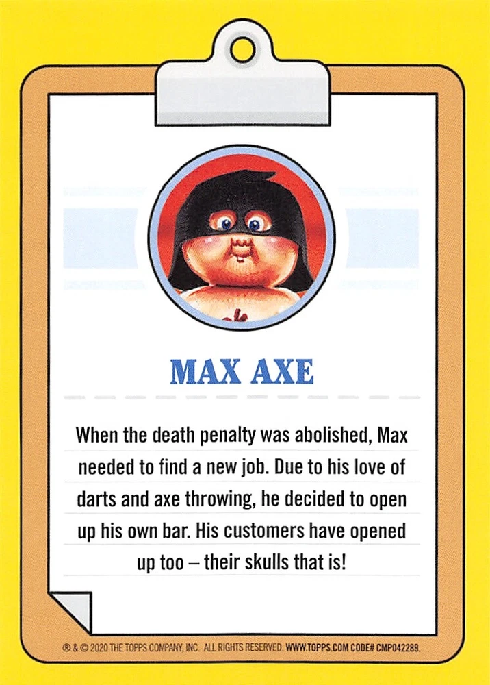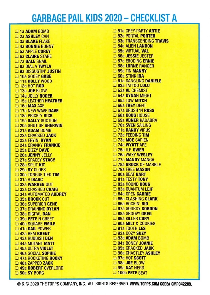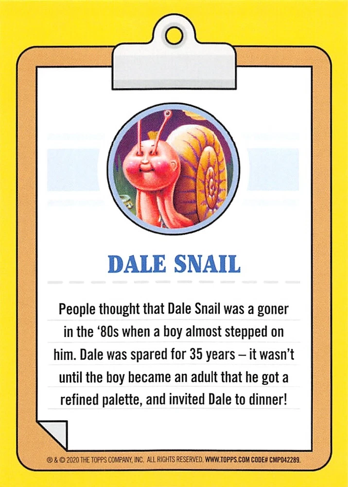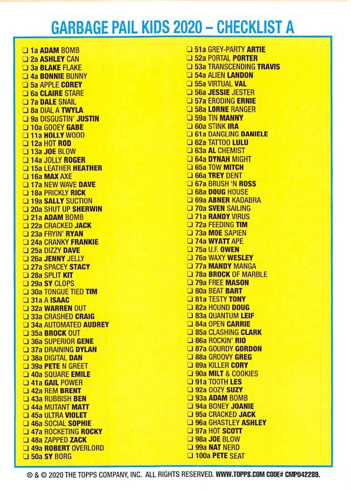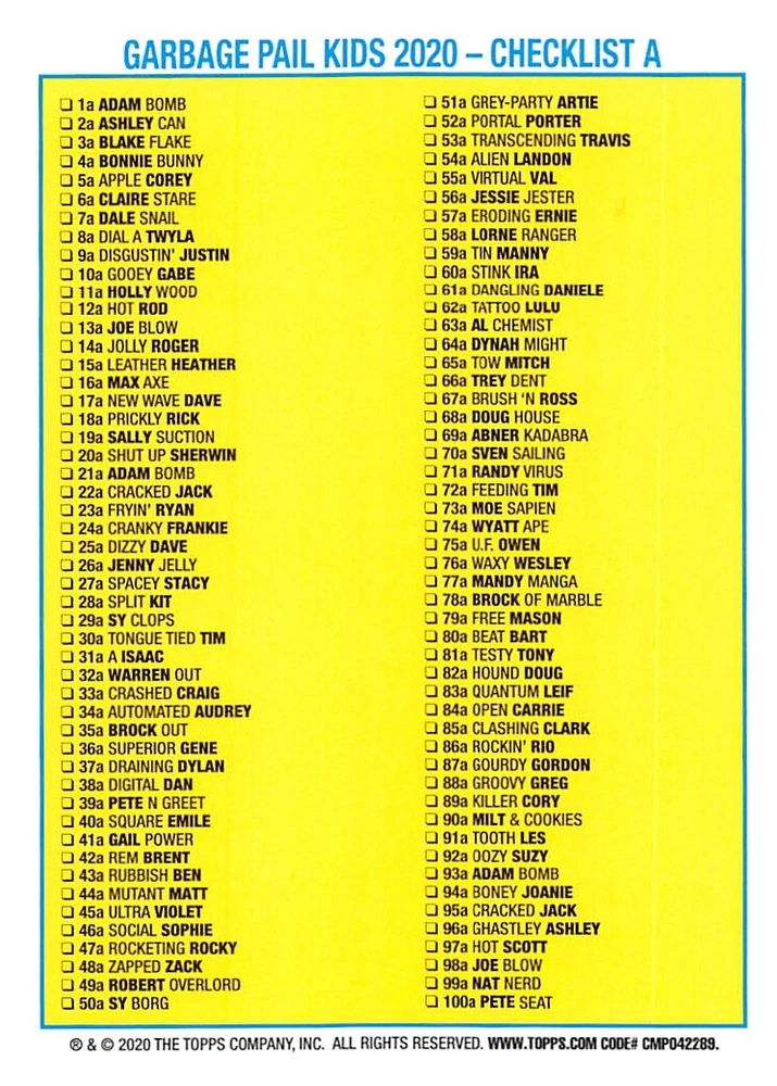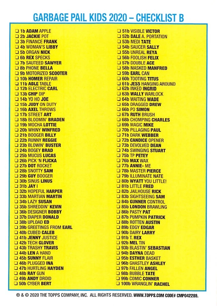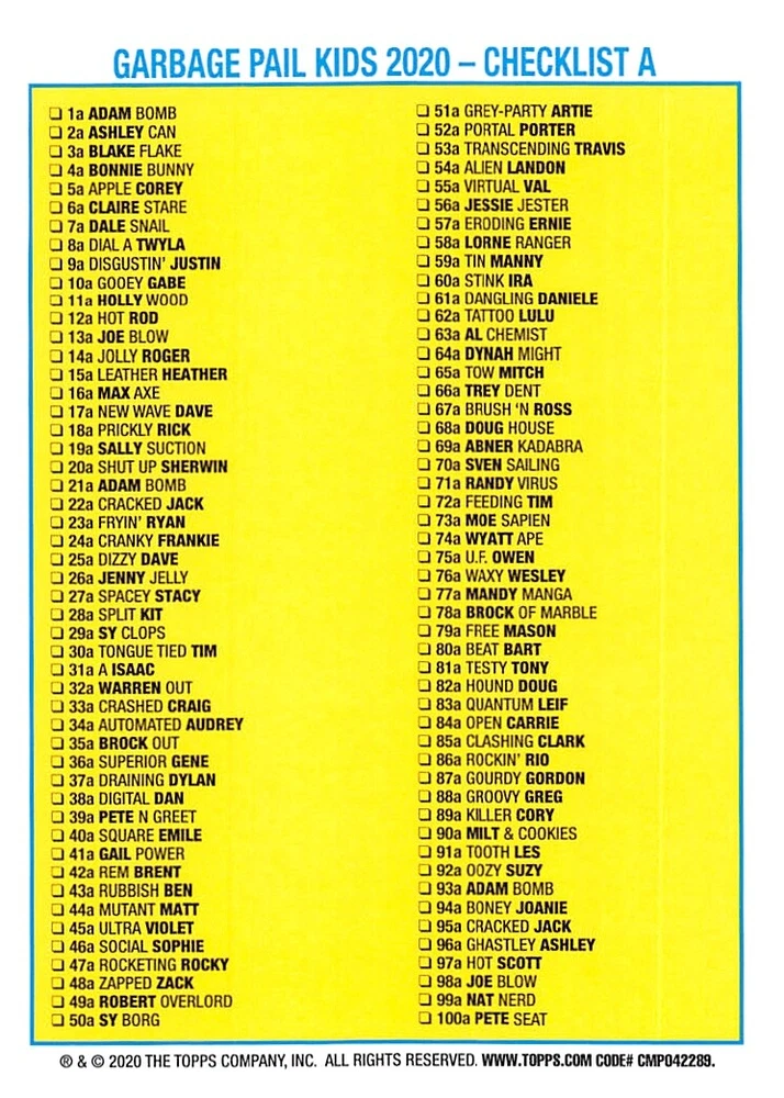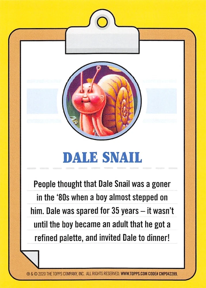 This listing is for your choice of any available 2020 Topps Garbage Pail Kids "35th Anniversary" green border parallel card from the drop-down menu above. Photos show front and backside of each card, be sure to scroll sideways to view front and backside photos! Check out my other listings for more single parallels from this same set. Any questions? Please ask before buying. International "USPS First Class Mail" will not include a tracking number for this item, if you would like a tracking number please choose the "eBay International Standard Shipping" option when you check out. Any questions? Just ask! As with all of my "pick-a-card" listings, I will be shipping with "eBay Standard Envelope". The rules of this envelope state that it cannot be too thick, so please expect your order to be packaged as follows: 1 to 6 cards will be slid into a single sleeve, the sleeve will then be slid inside of a semi-rigid Card-Saver. 6 to 12 cards will be slid into a double sleeve, 13 to 18 cards into a triple sleeve, 19 to 24 cards into a quadruple sleeve(up to six cards per sleeve). The double, triple and quadruple sleeve shipping will not have the Card-Saver. If you buy more than 1 card and want it packaged with more than 1 Card-Saver(or 1 sleeve per card), I kindly ask that you contact me before purchasing to be sure that this is possible to have it done with the stated shipping charge, or if additional shipping would be required. If you do not contact me, then you can expect to receive your order packaged as I have explained here. Please do not expect rigid top-loaders to be included, I don't normally keep a lot of them in stock, but if you message me prior to ordering I will be able to see if I have any that can be included with your order - additional shipping may be required. In order to get free combined shipping from this and any of my other "pick-a-card" listings, you must add all of your cards to the cart and check out when you are done shopping. If you do not use the cart you will be overpaying on shipping and I cannot refund you on over-payed shipping. So please use the cart and get your FREE COMBINED SHIPPING!