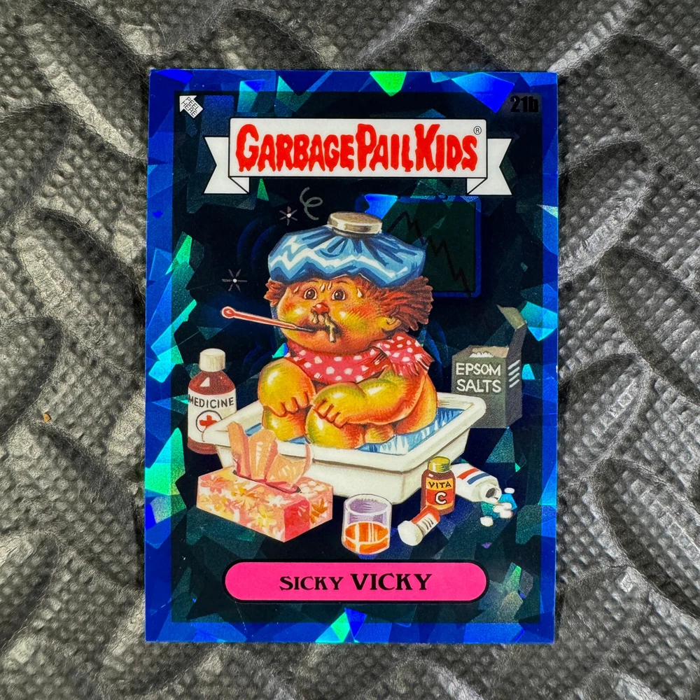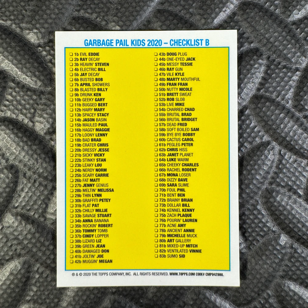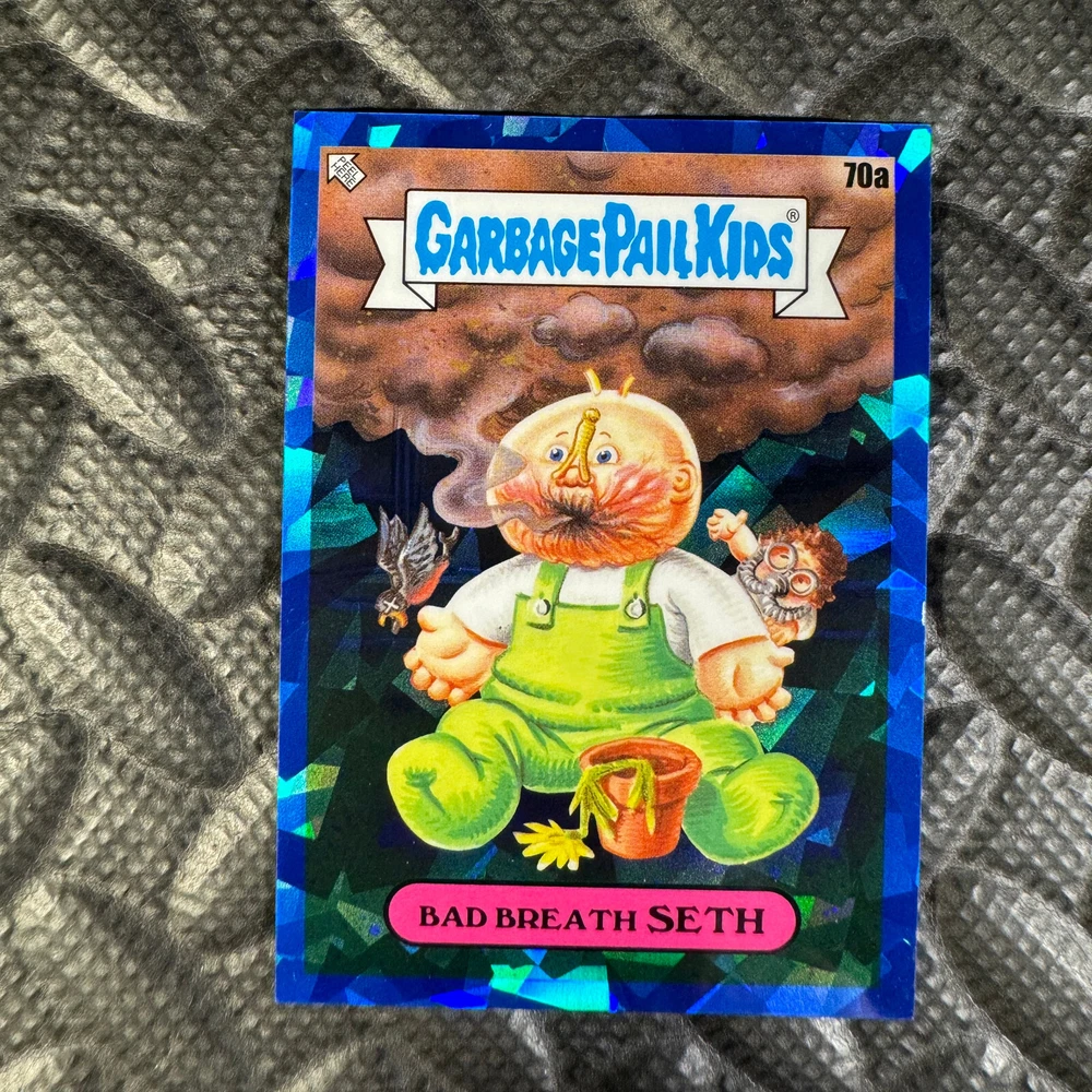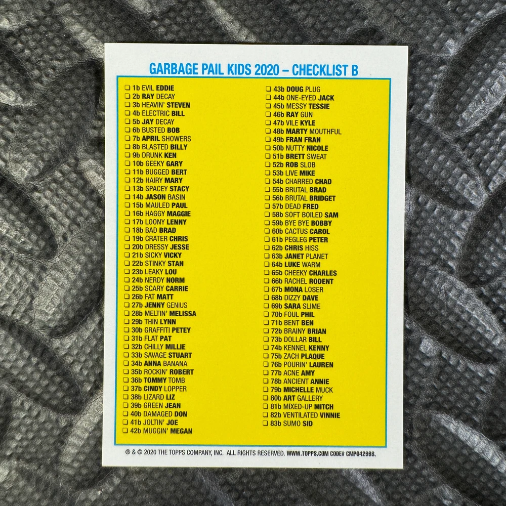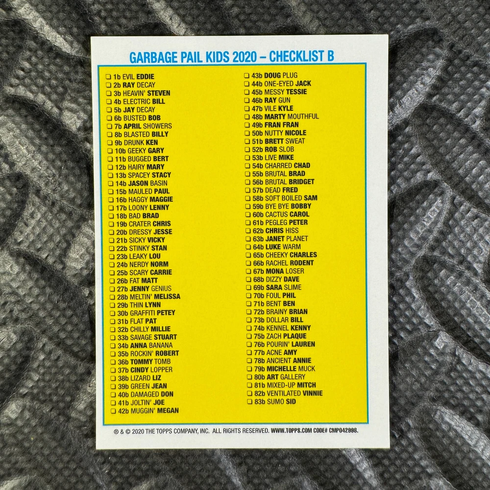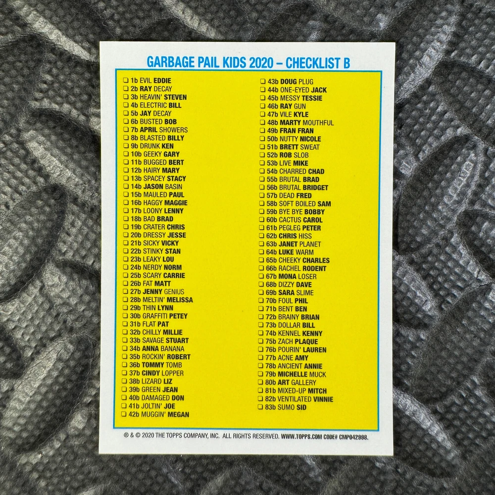 This listing is for your choice of any available 2020 Topps Garbage Pail Kids "Sapphire Edition Series 1" base card from the drop-down menu above. Photos show front and backside of each card, be sure to scroll sideways to view front and backside photos! The photos that you see, represent the card that you are buying, it is NOT particularly the card that you are buying! It would be a HUGE job to upload a new photo after every sale, so please look at these photos as "stock" photos. If you want a card with better centering, I can pick one, but I am not going to search out a dead-centered card for you. That being said, if you need a well-centered card, please put a note in when you check out. If it does not matter, then just check out and you will get the luck of the draw, as I normally pull singles at random. Any questions? Please ask before buying. International "USPS First Class Mail" will not include a tracking number for this item, if you would like a tracking number please choose the "eBay International Standard Shipping" option when you check out. As with all of my "pick-a-card" listings, I will be shipping with "eBay Standard Envelope". The rules of this envelope state that it cannot be too thick, so please expect your order to be packaged as follows: 1 to 6 cards will be slid into a single sleeve, the sleeve will then be slid inside of a semi-rigid Card-Saver. 7 to 12 cards will be slid into a double sleeve, 13 to 18 cards into a triple sleeve, 19 to 24 cards into a quadruple sleeve(up to six cards per sleeve). The double, triple and quadruple sleeve shipping will not have the Card-Saver. If you buy more than 1 card and want it packaged with more than 1 Card-Saver(or 1 sleeve per card), I kindly ask that you contact me before purchasing to be sure that this is possible to have it done with the stated shipping charge, or if additional shipping would be required. If you do not contact me, then you can expect to receive your order packaged as I have explained here. Please do not expect rigid top-loaders to be included, I don't normally keep a lot of them in stock, but if you message me prior to ordering I will be able to see if I have any that can be included with your order - additional shipping may be required. In order to get free combined shipping from this and any of my other "pick-a-card" listings, you must add all of your cards to the cart and check out when you are done shopping. If you do not use the cart you will be overpaying on shipping and I cannot refund you on over-payed shipping. So please use the cart and get your FREE COMBINED SHIPPING!