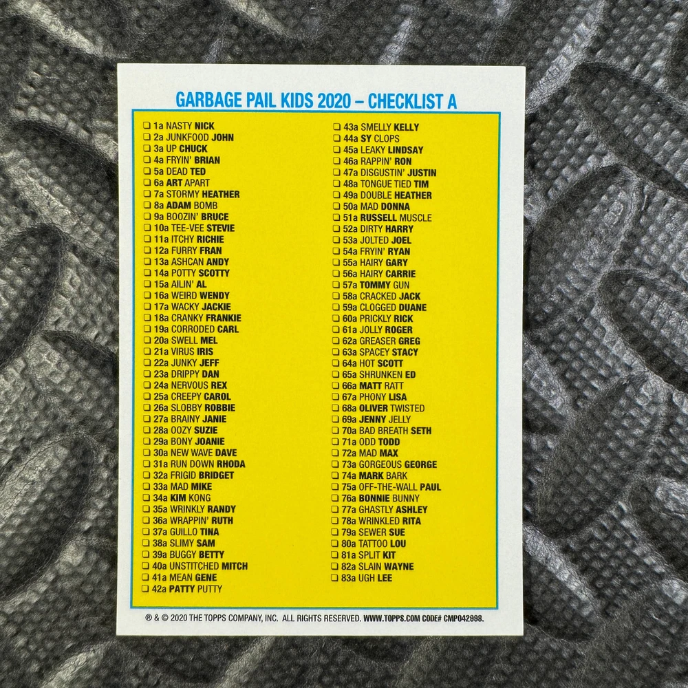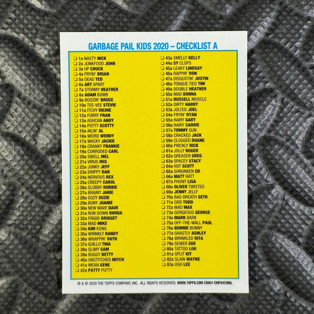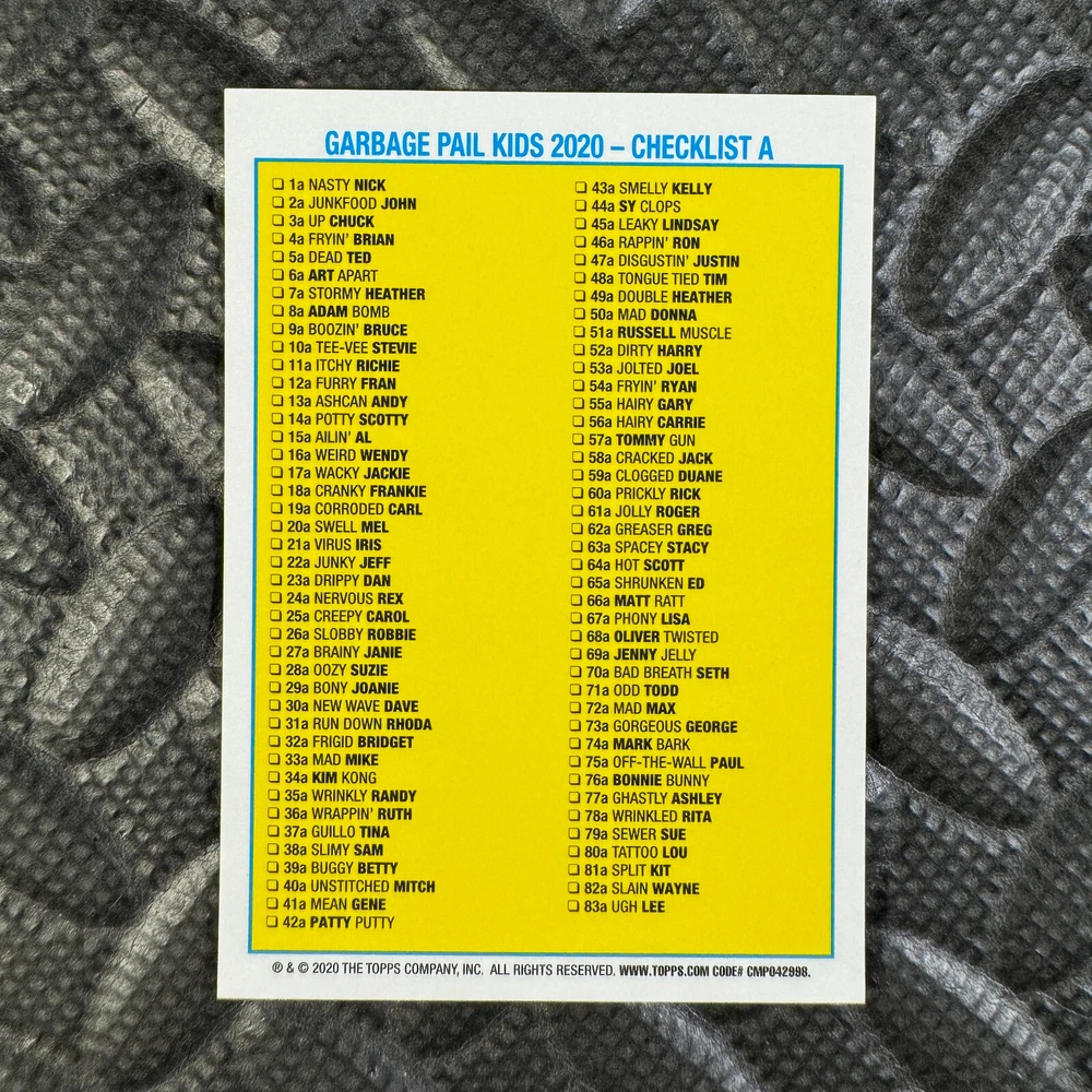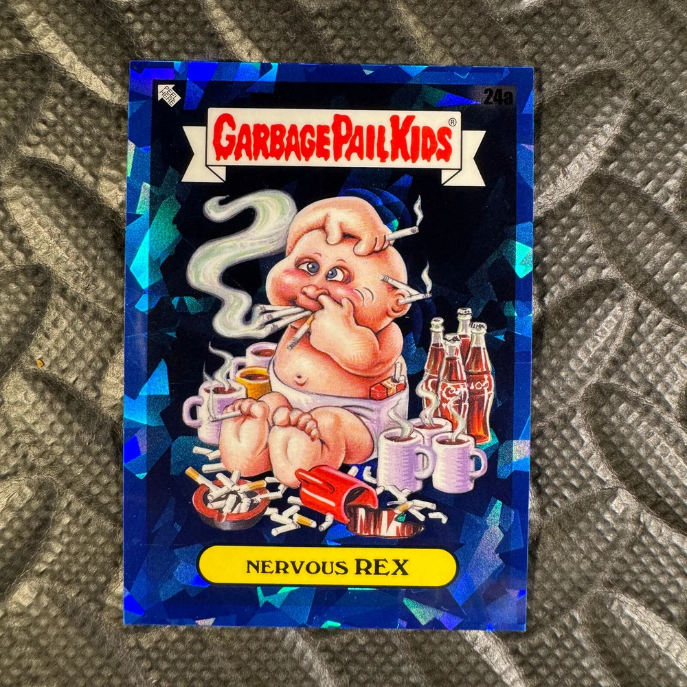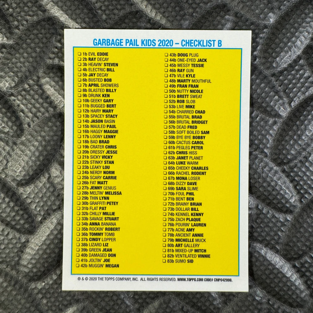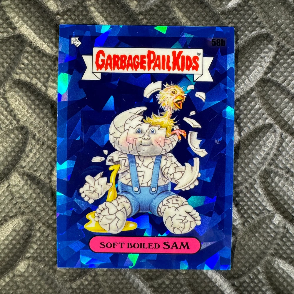 This listing is for your choice of any available 2020 Topps Garbage Pail Kids "Sapphire Edition Series 1" base card from the drop-down menu above. Photos show front and backside of each card, be sure to scroll sideways to view front and backside photos! The photos that you see, represent the card that you are buying, it is NOT particularly the card that you are buying! It would be a HUGE job to upload a new photo after every sale, so please look at these photos as "stock" photos. If you want a card with better centering, I can pick one, but I am not going to search out a dead-centered card for you. That being said, if you need a well-centered card, please put a note in when you check out. If it does not matter, then just check out and you will get the luck of the draw, as I normally pull singles at random. Any questions? Please ask before buying. International "USPS First Class Mail" will not include a tracking number for this item, if you would like a tracking number please choose the "eBay International Standard Shipping" option when you check out. As with all of my "pick-a-card" listings, I will be shipping with "eBay Standard Envelope". The rules of this envelope state that it cannot be too thick, so please expect your order to be packaged as follows: 1 to 6 cards will be slid into a single sleeve, the sleeve will then be slid inside of a semi-rigid Card-Saver. 7 to 12 cards will be slid into a double sleeve, 13 to 18 cards into a triple sleeve, 19 to 24 cards into a quadruple sleeve(up to six cards per sleeve). The double, triple and quadruple sleeve shipping will not have the Card-Saver. If you buy more than 1 card and want it packaged with more than 1 Card-Saver(or 1 sleeve per card), I kindly ask that you contact me before purchasing to be sure that this is possible to have it done with the stated shipping charge, or if additional shipping would be required. If you do not contact me, then you can expect to receive your order packaged as I have explained here. Please do not expect rigid top-loaders to be included, I don't normally keep a lot of them in stock, but if you message me prior to ordering I will be able to see if I have any that can be included with your order - additional shipping may be required. In order to get free combined shipping from this and any of my other "pick-a-card" listings, you must add all of your cards to the cart and check out when you are done shopping. If you do not use the cart you will be overpaying on shipping and I cannot refund you on over-payed shipping. So please use the cart and get your FREE COMBINED SHIPPING!