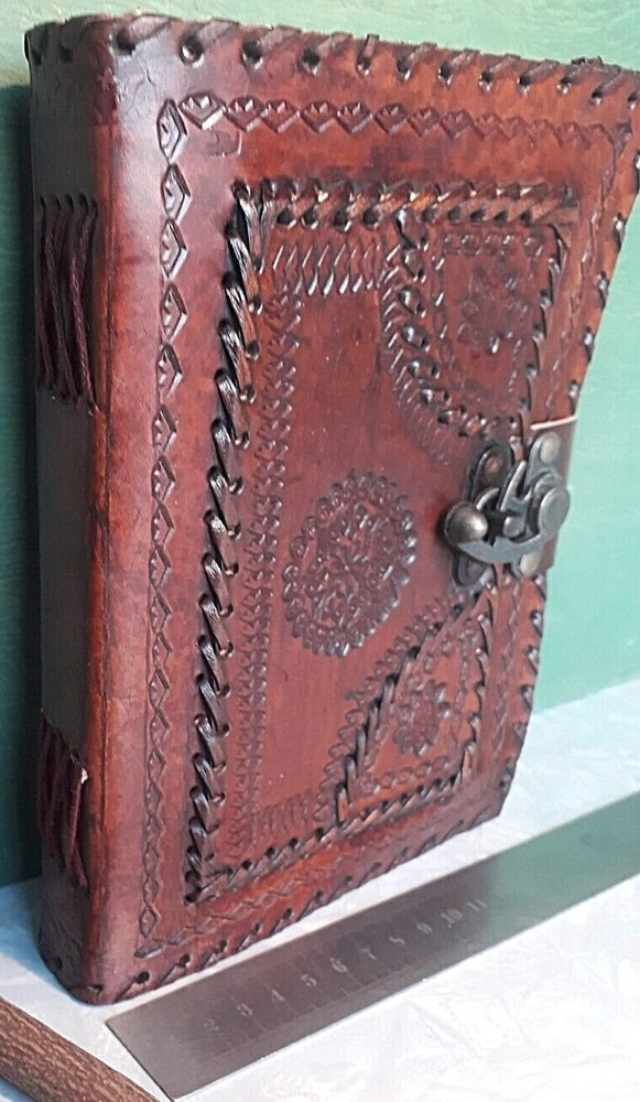 GENUINE Embossed LEATHER BOUND NOTEBOOK/DIARY (with C-lock clasp) EACH OF OUR LEATHER NOTEBOOKS HAS BEEN HAND CUT,HOLED AND BOUND USING TRADITIONAL LEATHER CRAFTING AND BOOK BINDING SKILLS . THEY ARE FINISHED WITH NATURAL VEGETABLE BASED DYES, AND LIGHTLY BUFFED TO GIVE AN ANTIQUE LEATHER BOOK FINISH. THE INSIDE PAGES ARE MADE WITH HANDMADE PAPER IN 1 VARIATION; 1, UNBLEACHED(Cartridge/Sketch paper), THE PAGES are in 5 attached booklets ranging from a total of 80 to 100pages(160-200 sides) THESE BEAUTIFUL BOOKS COME IN 1 SIZE and 1 Embossed design; LARGE: LENGTH= 20 C.M. WIDTH=16 C.M. DEPTH= 4 C.M. PLEASE NOTE: WE USE ONLY WATER BUFFALO and COW HIDES, and GOATSKINS from OLD DAIRY ANIMALS that are PAST a USEFUL AGE or FALLEN (Naturally Dead). THERE ARE NO ANIMALS BRED AND SLAUGHTERED FOR THE PURPOSE OF PRODUCING LEATHER FOR OUR JOURNALS. OUR LEATHER is TANNED with TREE BARK and FINISHED with a NATURAL VEGETABLE DYE in STARK CONTRAST to using CHROME TANNING which is HIGHLY TOXIC,WATER POLLUTING and known to be CARCINOGENIC. THIS NATURAL DYE CAN LEAVE A SMALL RESIDUE ON THE SURFACE OF THE LEATHER WHICH MIGHT COME OFF ON YOUR HANDS ON FIRST HANDLING OF THE BOOK. THIS IS TOTALLY HARMLESS AND WILL STOP IN TIME WHEN THE DYE STABILISES. WE HOPE YOU AGREE THAT THIS IS A SMALL PRICE TO PAY TO HELP REDUCE THE POISONING OF OUR ENVIRONMENT. We are a Fair Trade Company, and as such ensure that we visit all out suppliers personally to check the working conditions of the people making our products before placing any order. None of our suppliers ever has to borrow money to fullfil our orders, as we never return products or withhold payment. We deal only with small family firms, and this has given us the wonderful opportunity over the years to see them prosper and grow their businesses. We strive to invest in Eco-Friendly and Re-cycled products whereever possible, with the aim of reducing our impact on the environment. We hope you enjoy our products as much as we have enjoyed bringing them to you.
