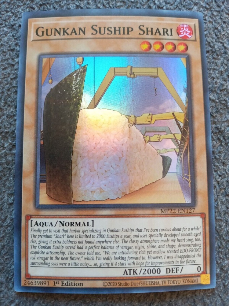 You are bidding on : 1 x Yu-Gi-Oh 2022 Mega-Tin: Pharaoh's Gods GUNKAN SUSHIP SHARI (Super Rare - 1st Edition) MP22-EN127 " Each card has gone straight from the pack to storage, and will go straight from storage to you. While each card is unplayed and could be considered 'pack fresh', due to current manufacturing standards and the type of packaging used, there are minor factory defects present on each card, primarily in the form of mild wear on back corners. " "Most MP22 tin singles are Near Mint Minus to Near Mint" All cards are in Near Mint condition unless specified Pictures are stock pictures ONLY it is not of the actual card How we identify the condition of the card: Near Mint: Most of the time cards in this condition are pack fresh but, the card may have minor flaws that are not visible with a quick inspection, small white dots or scratches that you have to closely examine the card to see. Excellent: Overall the card looks near mint but may have minor scratches, slightly worn edges that are visible but they do not interfere with the way the card looks. Lightly Played: Similar to a card in excellent condition except there is more whitening around the edges and the corners are a little more worn or slight bends or creases that are visible. There might be some slight whitening on the back or front of the card. Imperfections will be visible with a quick inspection. When the card is sleeved the imperfections will not be noticeable and the card will look just like the rest of your cards Played: There is a large amount of whitening around the edges and the corners have a good amount of damage, many scratches, bends and/or creases on the card. When the card is sleeved it can still be played Shipping and Handling : Canada Shipping is $1.50 CAD Tracking is offered for $13 CAD BUT tracking is required on any purchases that are over $50 CAD Please contact us for combined shipping if interested in purchasing multiple cards before paying USA Shipping is $1.99 CAD Regular Mail for all orders under $19.99 Shipping is $7.99 CAD with USPS tracking for all orders $19.99 and over Please contact us for combined shipping if interested in purchasing multiple cards before paying INTERNATIONAL Shipping is $4.99 CAD with regular mail Tracking is offered for $29.99 CAD BUT tracking is required for purchases over $50 CAD Please contact us for combined shipping if interested in purchasing multiple cards before you pay Combined shipping: We offer combined shipping: each and every additional item after the first one is only $0.25 (25 cents). To obtain combined shipping fees, please use the shopping cart or ask for the combined shipping invoice BEFORE you pay. If you pay item-by-item, right away after the purchase, we will not be able to offer you combined shipping anymore. Handling Your order will be shipped 1-3 business days after payment has been received *“Business days” are normal weekdays. Saturdays, Sundays, and major holidays do not count as business days. Cards purchased are packaged and shipped in a sleeve, toploaders, a team bag and an envelope to ensure protection of cards Payment : Payments should be made within 5 days after purchase Epic Cards and Games Any questions feel free to email us and allow 1 day for a response. Thanks for looking! Sales Tax (Canada Only) : Purchases made by Canadian residents are subject to applicable GST/HST, depending on your province/territory. (If you do not agree to this, please do not bid. We have a registered business in Canada and are required by law to charge taxes to anything shipped within the country.) Thank you for shopping with Epic Cards and Games