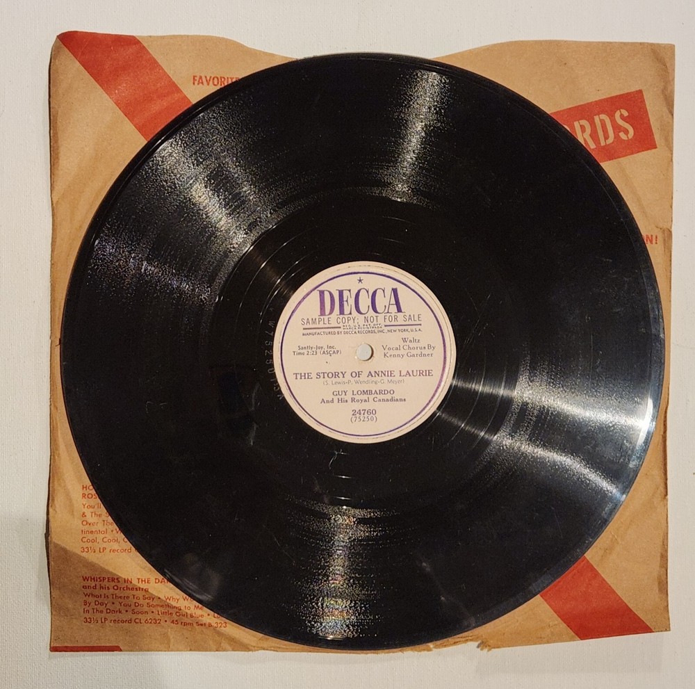Dive into the nostalgic melodies with Guy Lombardo's "The Story Of Annie Laurie" paired with "My Bolero" on a 10" shellac record, spinning at the classic speed of 78 RPM. Released in 1952 under Decca label, catalog number 24760, this single promises to deliver the timeless charm of the pop genre with an added touch of storytelling flair. Collectors will appreciate the piece as a promotional issue, featuring the craftsmanship of an era that continues to enchant vinyl aficionados. Whether you're looking to complete a collection or simply savor the auditory essence of the mid-20th century, this record is a slice of musical history.