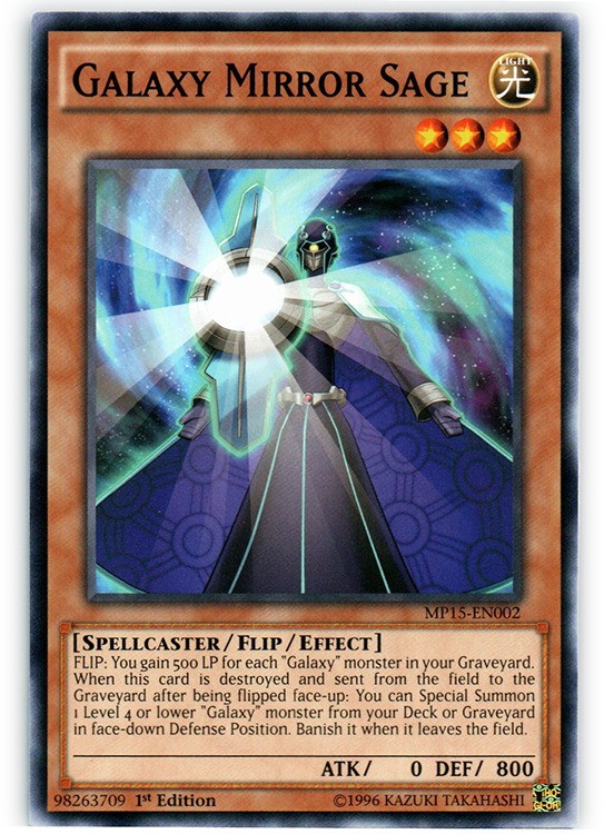 Galaxy Mirror Sage - MP15-EN002 - Common - 1st Edition Image is a stock photo of the card. You will receive the card in Moderately Played condition Condition: Moderately Played ATK/DEF : 0/800 Ability : Attack #1 : Attack #2 : Attack #3 : Attribute : Light Card Number : MP15-EN002 Card Rules : Card Text : FLIP: You gain 500 Life Points for each "Galaxy" monster in your Graveyard. When this card is destroyed and sent from the field to the Graveyard after being flipped face-up: You can Special Summon 1 Level 4 or lower "Galaxy" monster from your Deck or Graveyard in face-down Defense Position. Banish it when it leaves the field. Card Type : Flip Monster Edition : 1st Finish : HP : Illustrator : Level : 3 Manufacturer : Monster Type : Spellcaster Name : Galaxy Mirror Sage Passcode : 98263709 Pendulum Scale : Rarity : Common Resistance : Retreat Cost : Set : 2018 Mega Tin Pack Stage : Weakness : Be sure to visit our store for a wide selection of your favorite cards! We are running specials RIGHT NOW!! Shipping Options: ~Ships in a regular white envelope with a stamp for FREE! (THERE IS NO TRACKING INFORMATION AVAILABLE FOR THE ABOVE METHOD. SHIPPING TIME IS 4-10 BUSINESS DAYS) ~Ships in a TRACKEDbubble mailer for $5.99! ~Shipments are handled same or next business day. ~FREE SHIPPING for each additional card, so shop around our store!