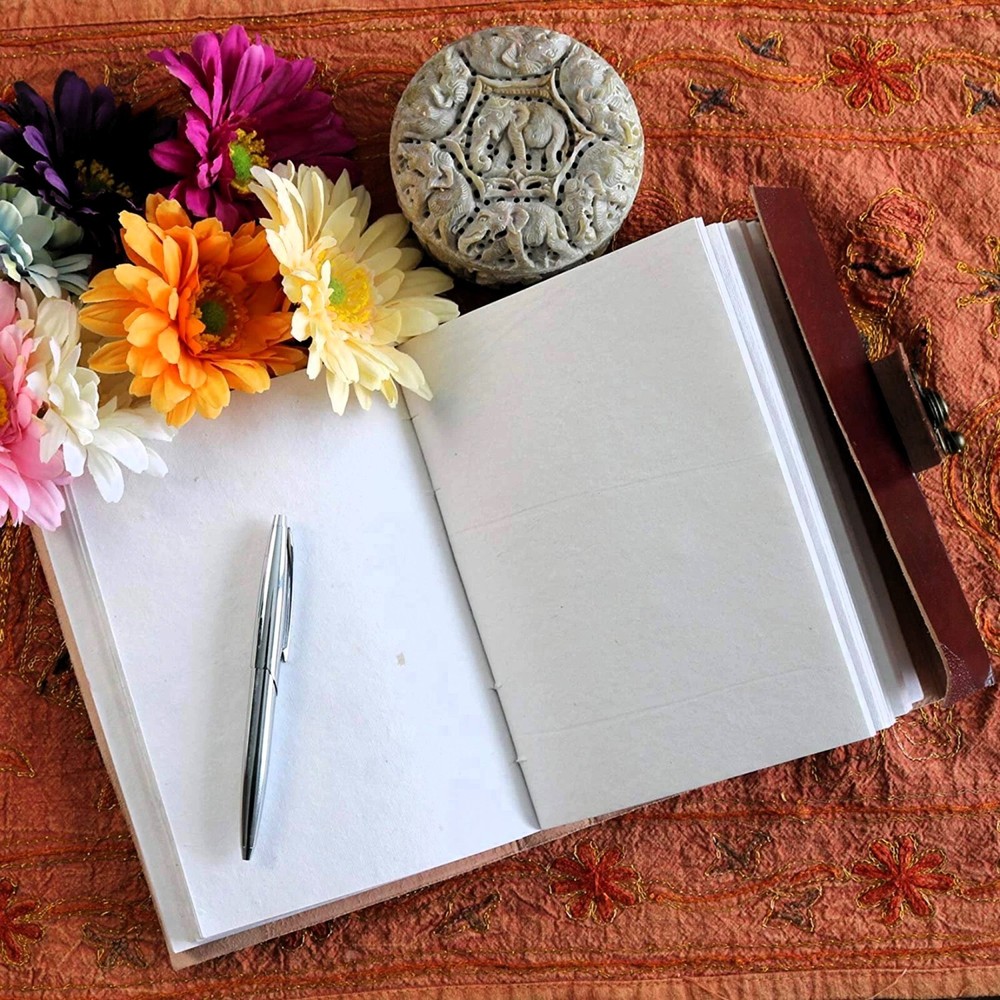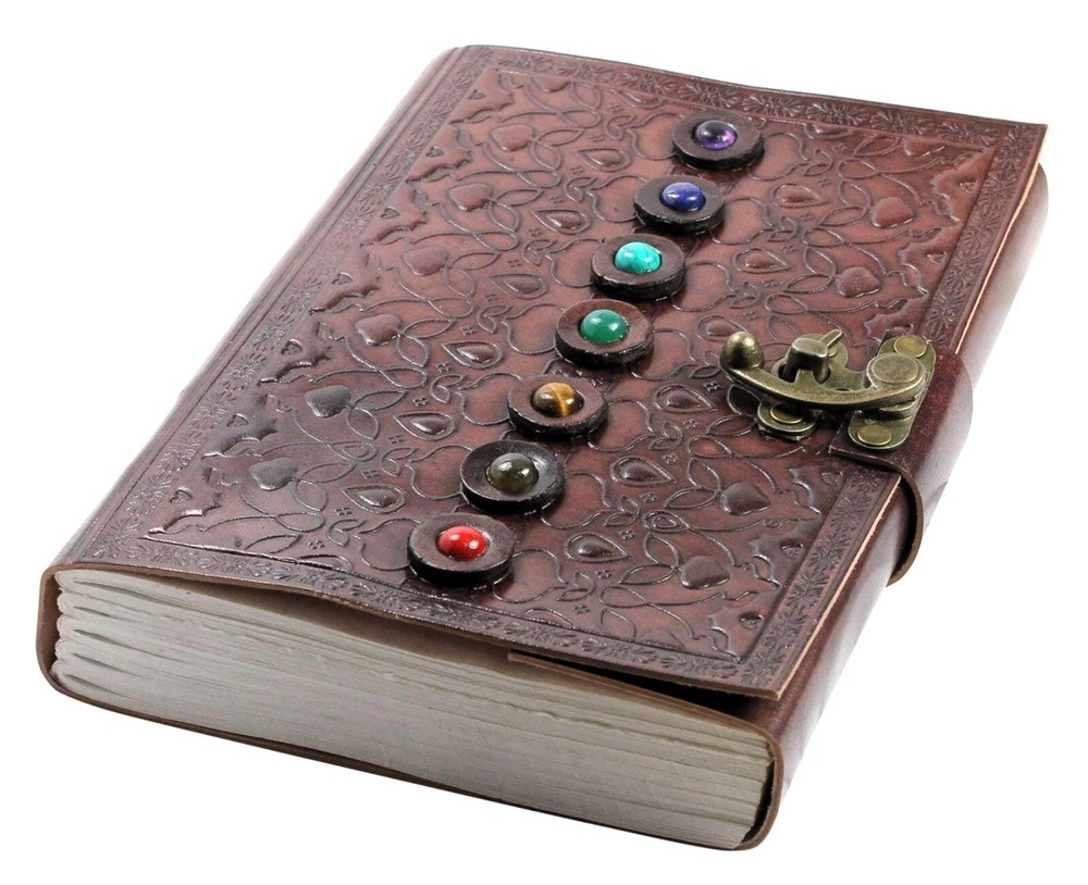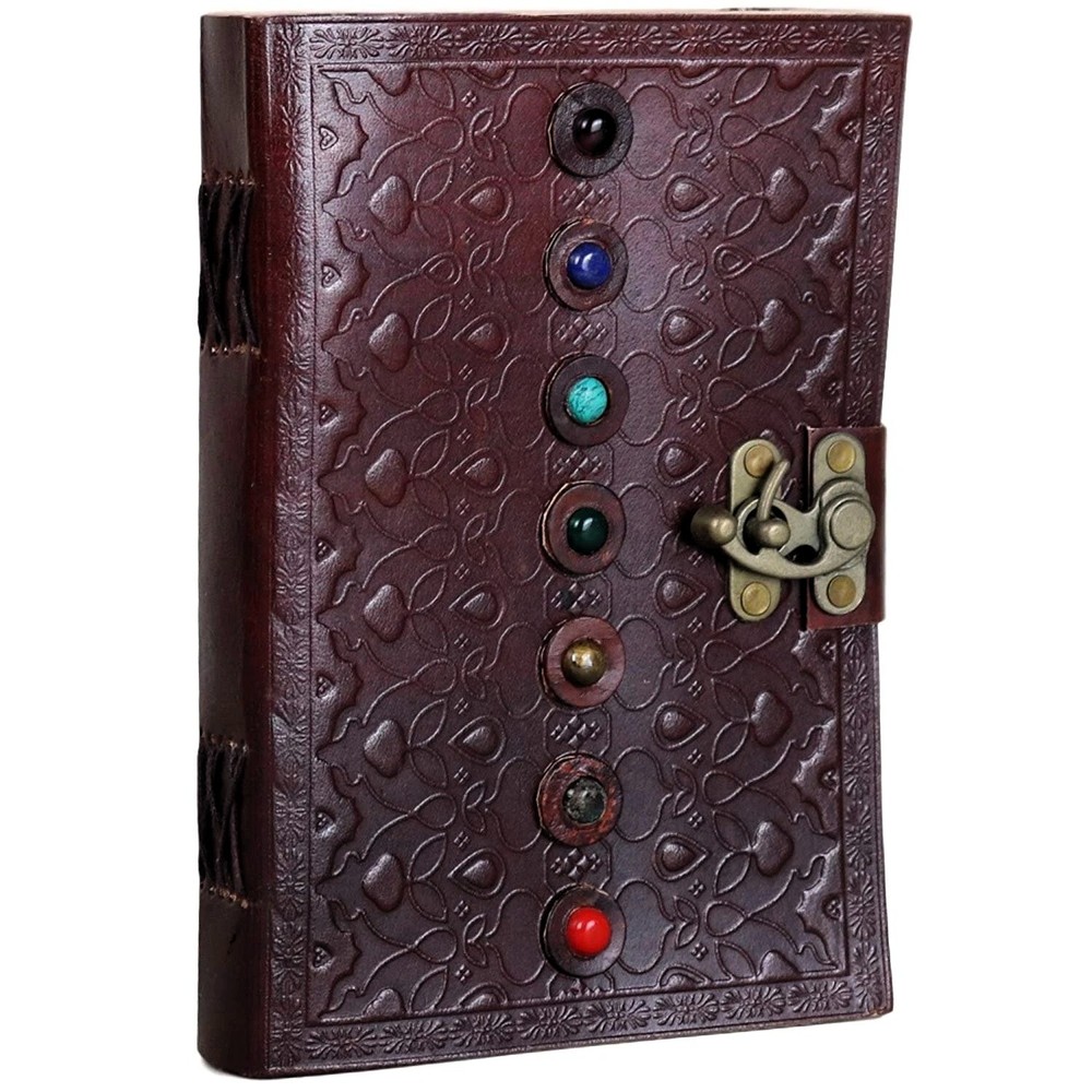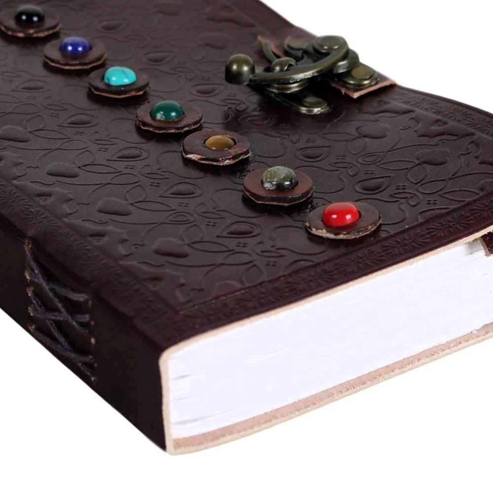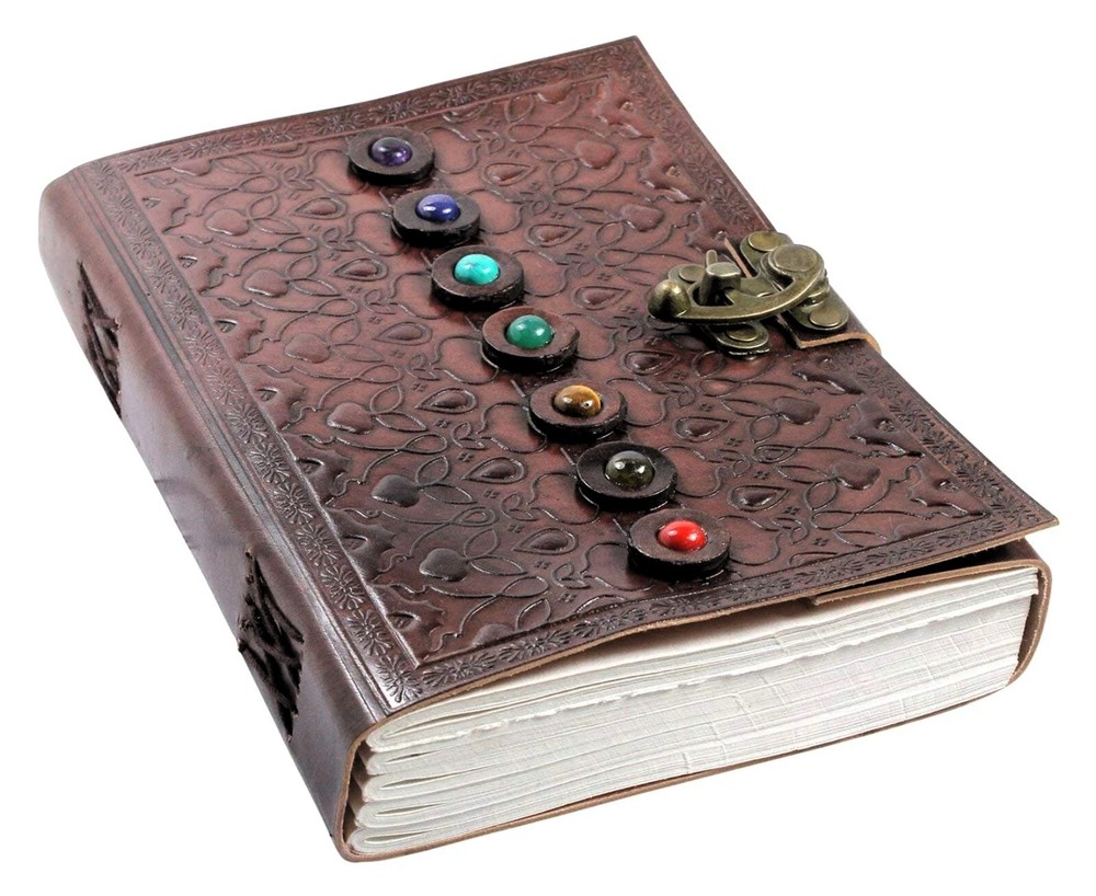 9x6 Handcrafted Leather Journal featuring 7 vertical stones on the front cover, & in the Chakra Style. Journal is a tri-fold design with a brass latch & Embossed leather covers. It is coptic bound to lay flat when open. & features 200 unlined pages of acid free handmade paper (made of cotton). A beautiful sketchbook & Personal journal that is destined to become a heirloom.
