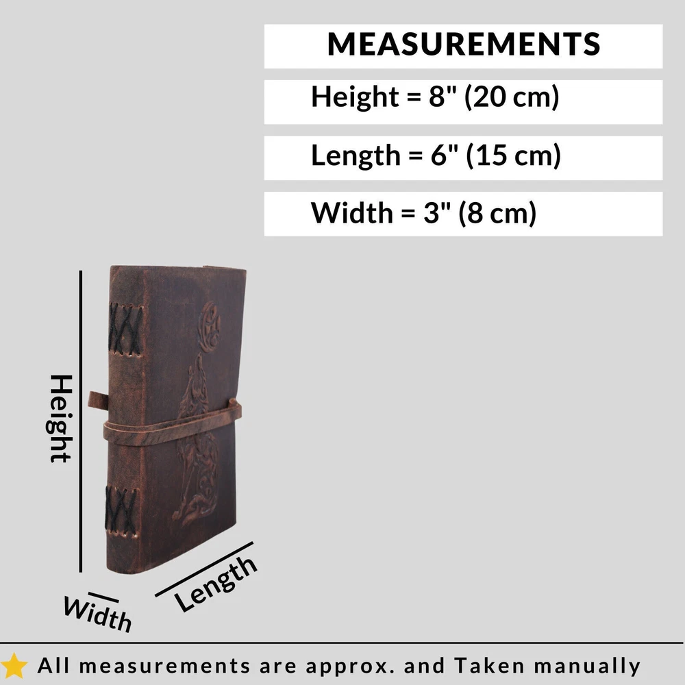 Welcome To MADOSH (Brand: Madosh- Mad Over ShoppingTM) Immerse yourself in the beauty of nature with our handcrafted wolf-embossed leather journal. This premium-quality notebook is more than just a place to jot down thoughts; it's a work of art. The intricate wolf design on the cover adds a touch of the wild to your creative endeavors. Whether you're a writer, artist, or nature lover, leather diary is a perfect companion. It's not just a notebook, it's a statement piece that reflects your love for both creativity and the wild. Crafted from genuine leather, the journal ages gracefully, developing a rich patina over time. The 200 page of our leather diary is made from premium-quality, acid-free paper. The smooth texture ensures a delightful writing experience. Whether for a friend, family member, or yourself, this leather diary makes a thoughtful and unique gift for birthdays, holidays, or special occasions. Size: Height: 8" (17.78 cm) | Length: 6" (13.97 cm) | Width: 3” (8 cm). Features: Genuine leather Wolf Embossed Clasp closure 100 sheets (200 pages) Country of origin: India Note: 100% Genuine leather diary. It is handmade and made by professional artisans. Paper used in diary are 100% recycled cotton acid free paper.