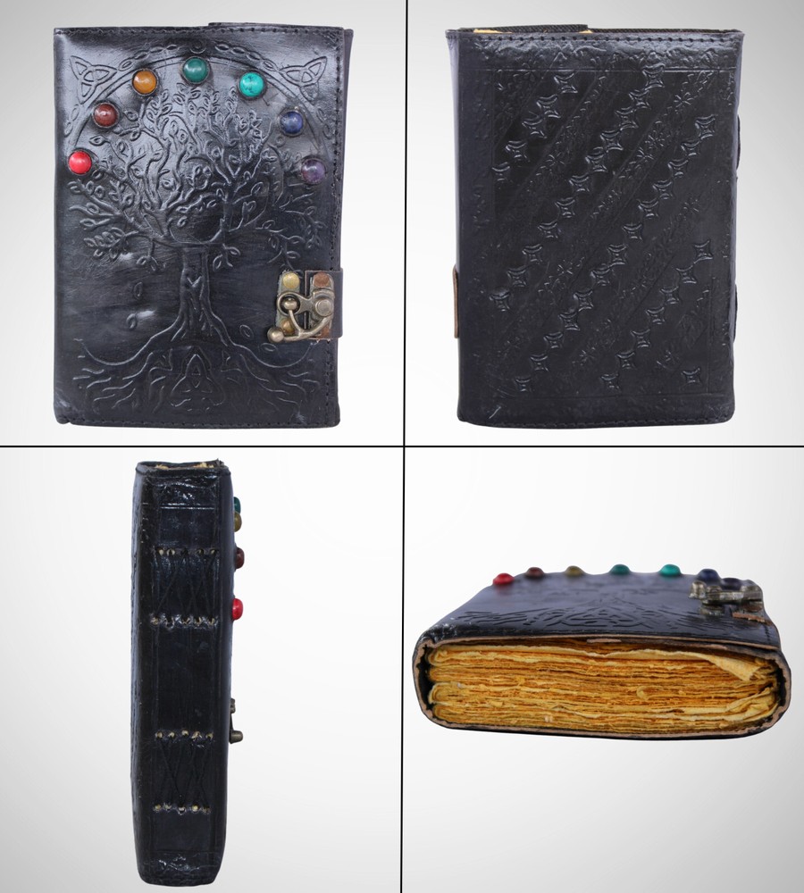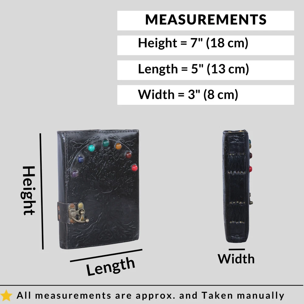 Embrace the opportunity to disconnect from screens and reconnect with tactile joy of pen and paper. Introducing our leather bound journal, crafted from genuine leather its sustainable choice that aligns with an Eco-conscious lifestyle. The black leather bound diary transcends trends offering a lasting appeal that never goes out of style. Subtle embossed and stone details on the cover enhance its visual appeal, adding a touch of classic charm to the journal. As you use the journal, the leather cover develops a unique patina that tells the story of your journey. Ideals for daily journaling, note taking, creative writing, sketches, or even as a cherished planner. Compact and easy to carry, it becomes your on-the-go companion for capturing thoughts, ideas and memories. A thoughtful and luxurious gift for anyone who appreciates the art of writing and fine craftsmanship. SIZE: Height: 7" (18 cm) | Length: 5" (13 cm) | Width: 3" (8 cm) FEATURES: Genuine leather 200 Pages Stone studded Clasp closure Vintage paper Handmade Country of origin: India NOTE: 100% Genuine leather diary. Color may slightly vary from pictures. Paper used in diary are 100% recycled cotton acid free paper.