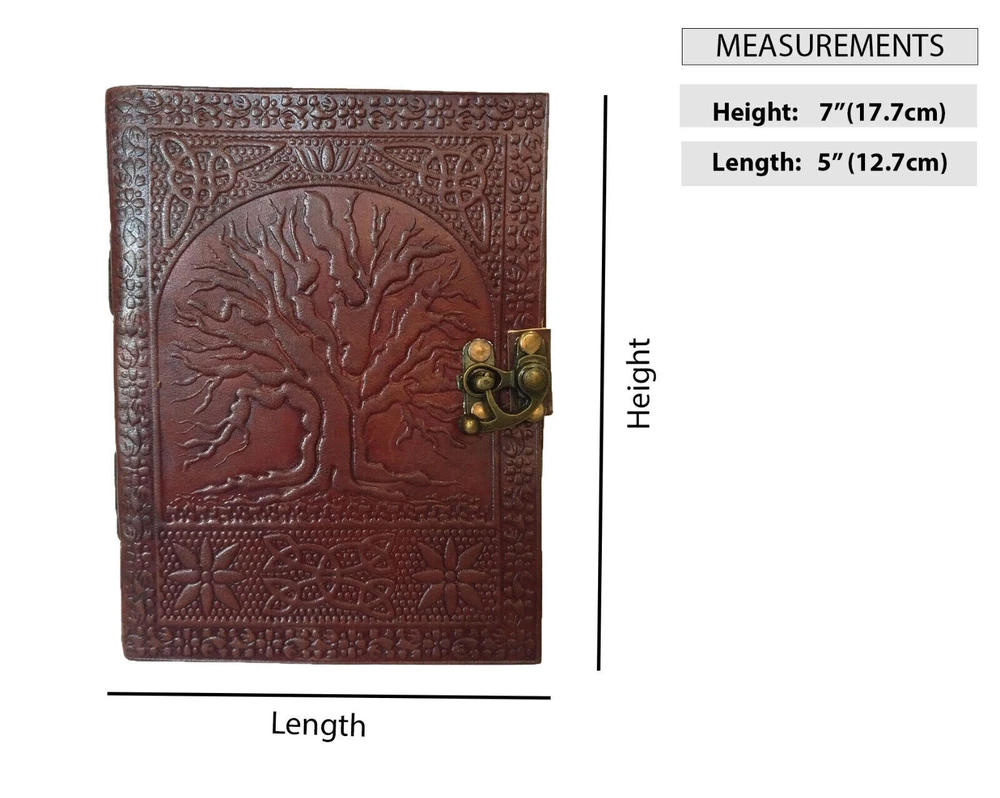 Welcome To MADOSH (Brand: Madosh- Mad Over ShoppingTM) Introducing our exquisite Handcrafted Leather Diary, a timeless and versatile companion for all your creative expressions and personal thoughts. Crafted with the utmost attention to detail, this leather journal is more than just a diary; it's a work of art and a keepsake that will stand the test of time. The diary is equipped with a sturdy clasp closure, ensuring that your private thoughts and memories are not only beautifully preserved but also kept confidential. A beautiful tree has been embossed upon the leather journal, which symbolises that all our wisdom is stored in the trees. Size: Height: 7" (18 cm) | Length: 5" (13 cm) | Width: 1" (2.5 cm). Features: Genuine leather Tree of life embossed Clasp closure 200 Pages Country of origin: India NOTE: 100% Genuine leather diary. Color may slightly vary from pictures. Paper used in diary are 100% recycled cotton acid free paper.
