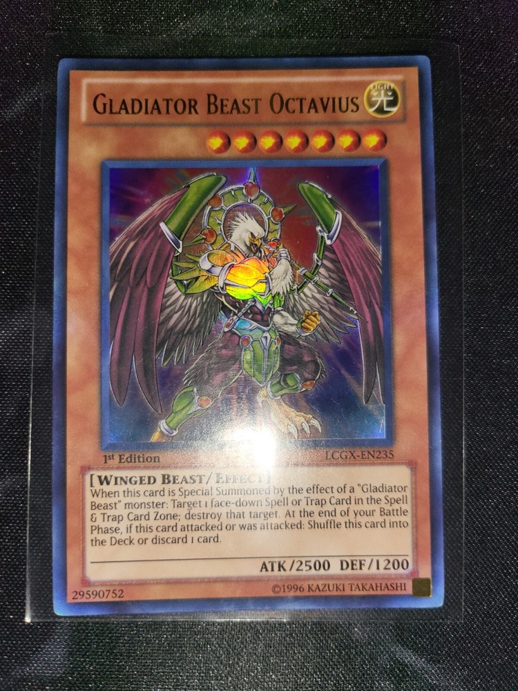 The product is a Yu-Gi-Oh! TCG card from the Legendary Collection 2: The Duel Academy Years set. The card is the Ultra Rare Gladiator Beast Octavius with attributes of Light color and a 1st Edition release. Manufactured by Konami, this English card is part of the collectible card game category and has a card number of LCGX-EN235. With a defense and attack power of 0, this collectible card is a valuable addition to any Yu-Gi-Oh! card collection.