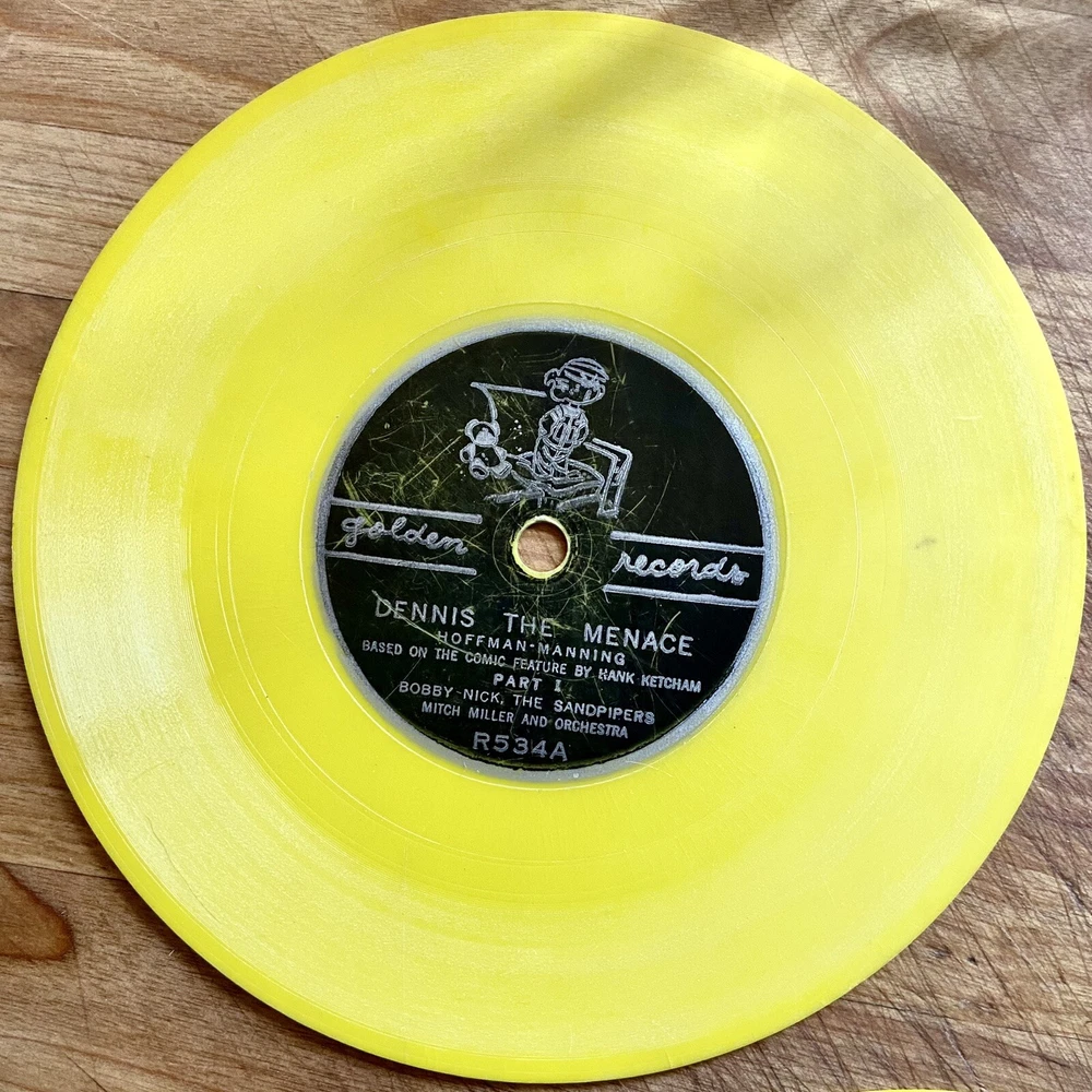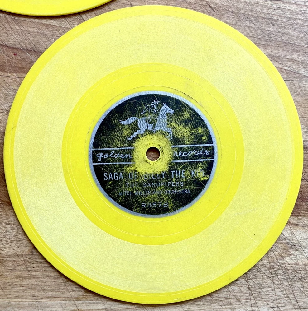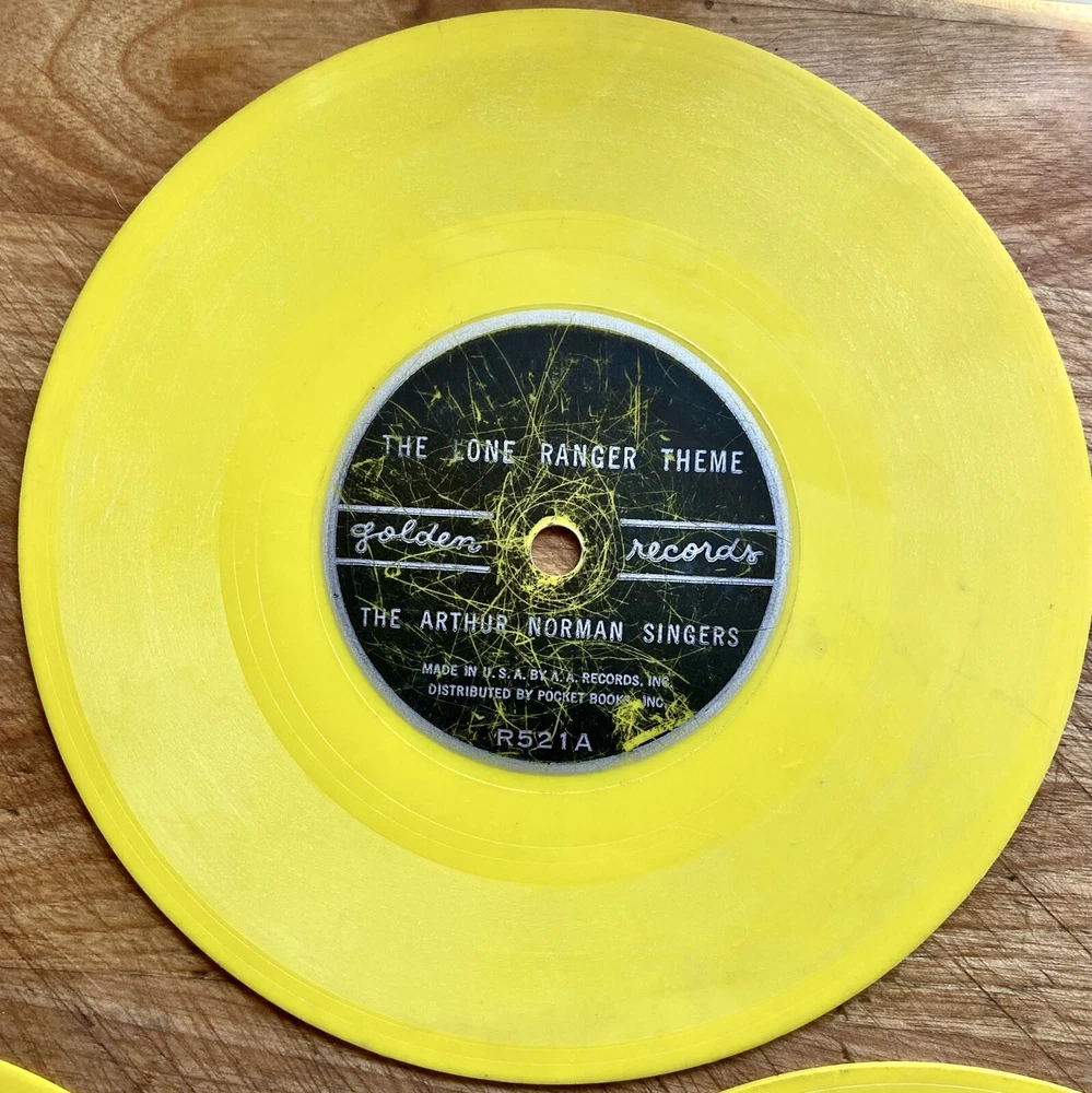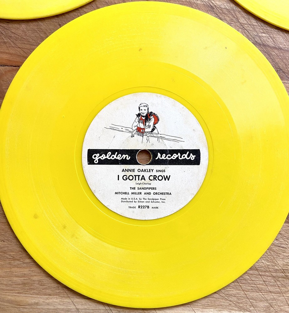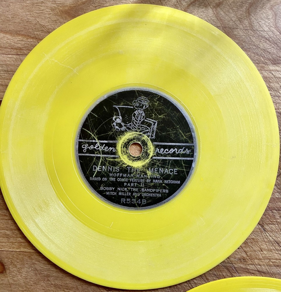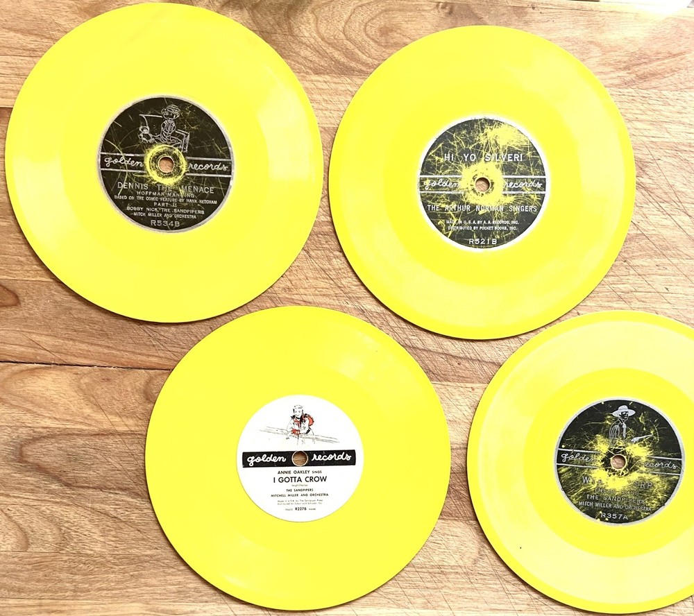This product is a lot of four Golden Records 78 RPM vinyl records featuring various artists and are “Sing Along” releases. The records are a first edition, single format with a 6" size and yellow-colored vinyl. The records are categorized as children's music with a style of sing-along and read-along, typical of the 1960s and 1970s. Made in the United States, these records are a nostalgic piece for collectors or music enthusiasts looking to add a unique and vintage touch to their collection. These records are in fair at best condition. Heavily used, several scratches and untested. Included are the following: R227A + B. Annie Oakley sings “Ten Gallon Hat” & “I Gotta Crow” by The Sandpipers & Mitchell Miller and Orchestra R375A + B “Wyatt Earp theme song” & “Saga of Billy the Kid” by The Sandpipers & Mitch Miller and Orchestra R521A + B “Hi Ho Silver” & “The Line Ranger Theme” by The Arthur Norman Singers. R534A + B “Dennis the menace” Parts one and two by Bobby Nick, The Sandpipers, Mitch Miler and Orchestra Please look carefully at all pictures and read entire description All sales are final- no returns I am not an expert nor a dealer, I describe and photograph all items to the best of my ability to help you determine if the item meets your standards for purchase. Ask questions or for specific pictures prior to purchase or bids