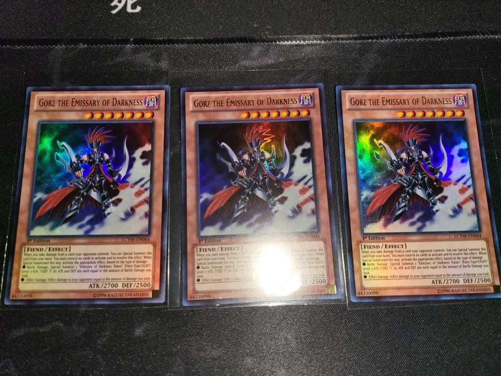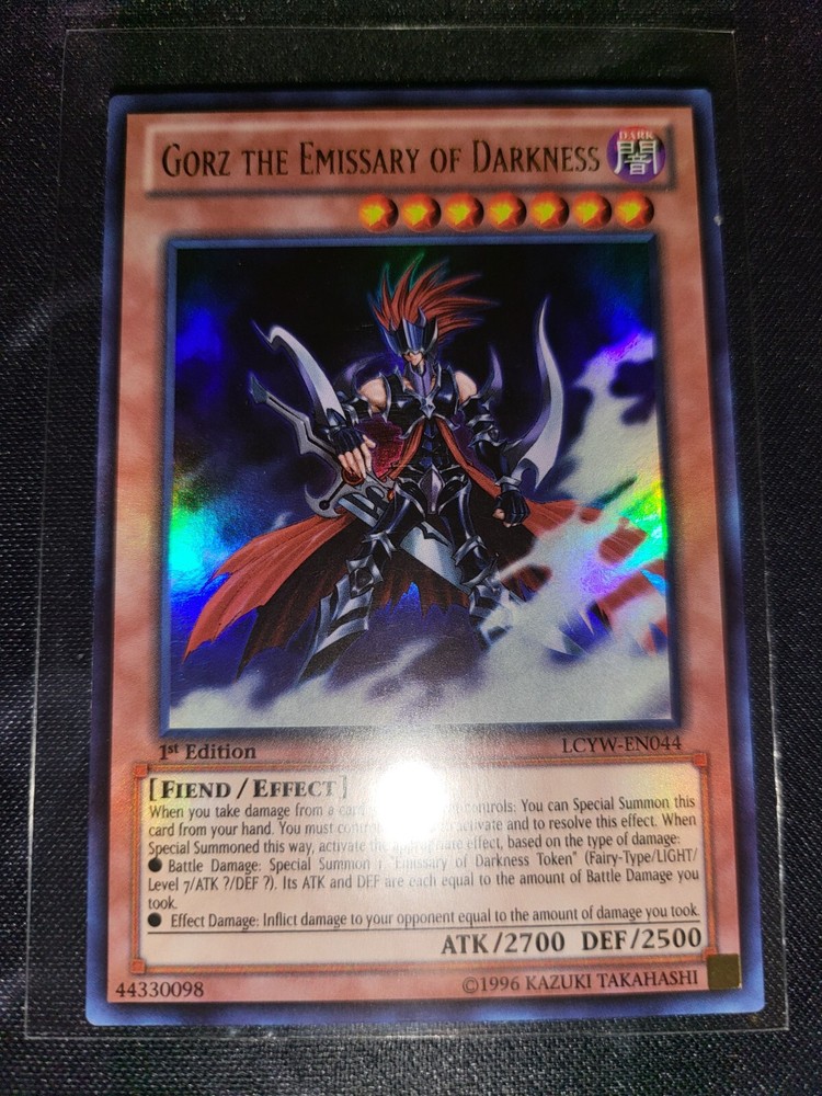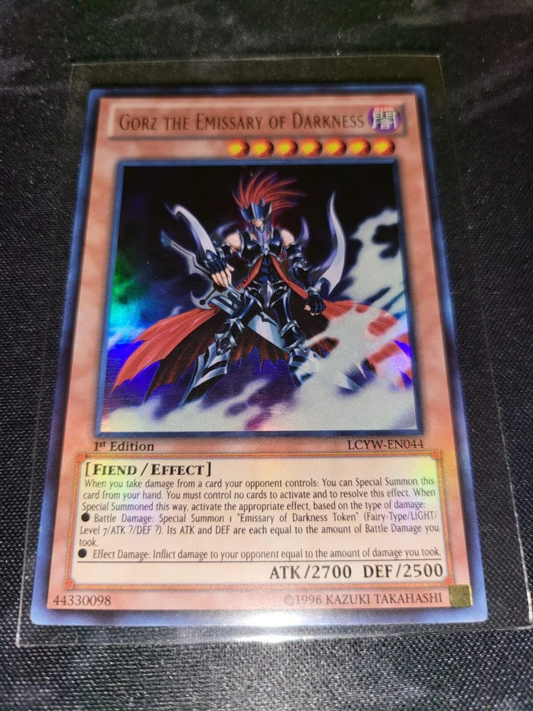 Gorz the Emissary of Darkness is an Ultra Rare English Yu-Gi-Oh! TCG card from the Legendary Collection 3: Yugi's World set. It is a Fiend-type creature with 2700 Attack and 2500 Defense. This 1st Edition card, manufactured by Konami, has the attribute "Dark" and is an Effect Monster with card number LCYW-EN044.