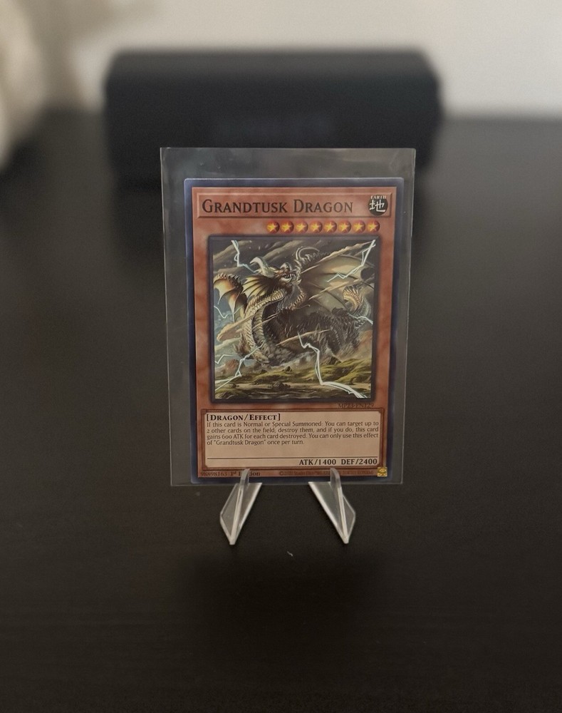 The "Grandtusk Dragon" card is from the 25th Anniversary Tin: Dueling Heroes Mega Pack for the Yu-Gi-Oh! TCG. It is a Common / Short Print card with 1st Edition features and belongs to the Earth attribute. This Dragon type card has an Attack/Power of 1400 and a Defense/Toughness of 2400, making it a formidable creature in gameplay. It is manufactured by Konami and has the card number MP23-EN129.