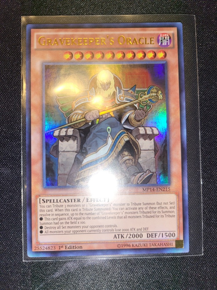 The Gravekeeper's Oracle MP14-EN215 card from the 2014 Mega-Tins Mega Pack is a highly sought-after collectible card in the Yu-Gi-Oh! TCG. This Ultra Rare card features a dark attribute and belongs to the spellcaster creature type, with impressive attack and defense stats of 2000 and 1500 respectively. Manufactured by Konami and in English, this effect card is a valuable addition to any collector's deck, especially for fans of the Gravekeeper archetype.
