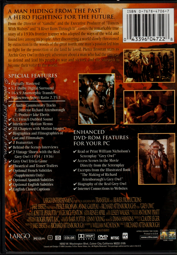 Based on a true story Experience the captivating drama of "Grey Owl" with this special edition DVD Starring Pierce Brosnan and Annie Galipeau, this Native American film directed by Richard Attenborough is a must-watch The DVD features an aspect ratio of 16:9 and NTSC video format, with a run time of 118 minutes This DVD is rated PG-13 and comes in a tall/DVD case It includes subtitles in English, French, and Spanish, as well as a variety of features such as commentary, retrospective interviews, behind the scenes featurette, and more The DVD is captioned and dubbed, making it accessible to a wider audience Don't miss out on this classic drama We use our own photos, not stock photos, so you can see the actual item for sale The Music Room CDs, DVDs, Movies, TV, Cassettes, Vinyl Records Even though most of our items are pre-owned they still have plenty of life left in them The packaging may be scratched dirty or even have minor cracks None of these issues will affect the quality of the playback Even though we check them prior to selling, sometimes a minor flaw may get past us If you purchase a CD, DVD, Cassette or a record from us and you are not happy with its condition, please contact us so we can make it right We want you to be happy with your purchase from us Be sure to check out our Cassettes, CDs, DVDs, Vinyl Records and more in our eBay store We Will Combine Shipping whenever possible to save on shipping costs.