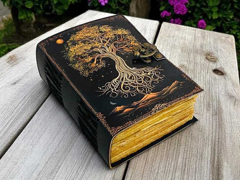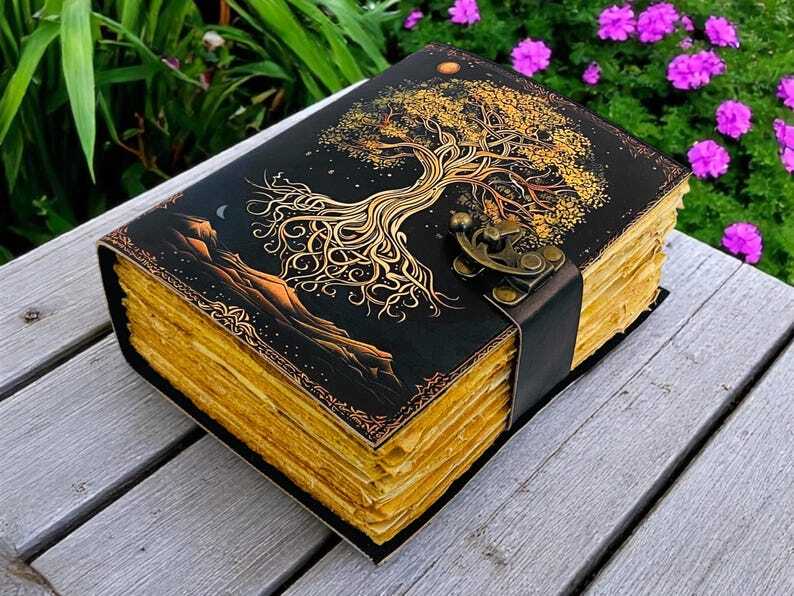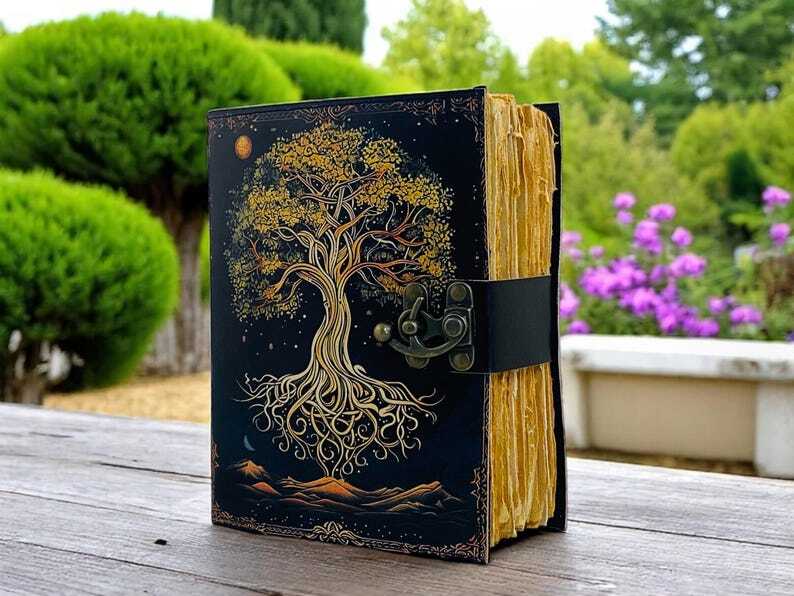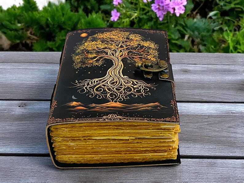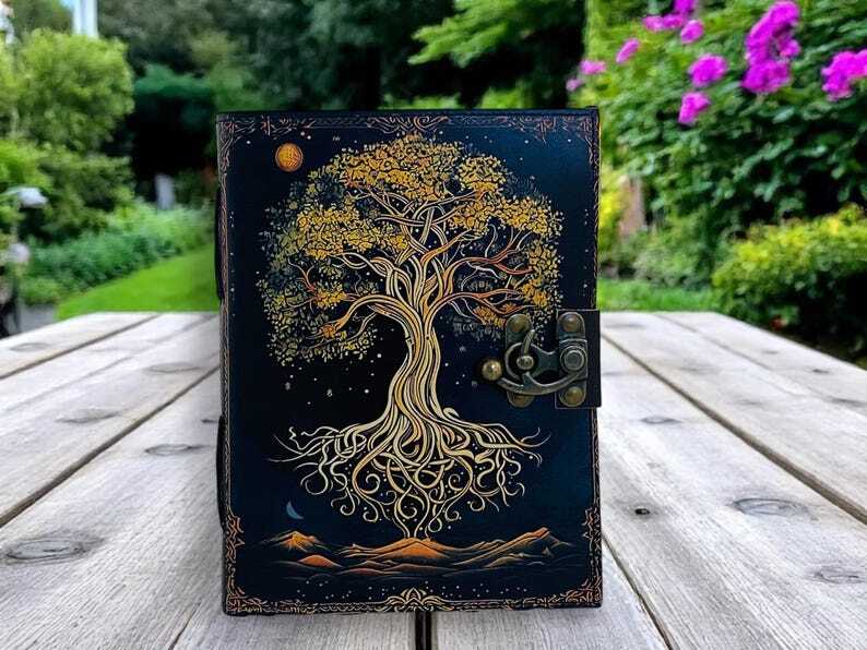 Large Grimoire leather journal, Print Tree of Life Journal, Blank spell book of shadows Leather Celestial Gifts for Him Her. • Print - Tree of life • Vintage lock closure • Genuine leather • Vintage deckle edge old paper • Handmade rustic cotton paper Size - 7x5 Inches, 8x6 Inches, 10x7 Inches ● Leather journal witchcraft book of shadows notebook is made with 200 pages of Antique Paper which looks like it was pulled from history. You will fall in love with the antique handmade cotton paper which is unique to our Vintage Journal Notebook. ● The vintage clasp lock will keep all your valuable writing locked inside. Sturdy hand stitched binding to make sure that no paper comes out loose from your spell notebook. ● Sketch, Doodle, Write on your Leather Blank Spell Journal with a Calligraphy Pen Fountain Pen, Brush Pen, Ball Pen, Acrylic Colors, Watercolor and many more. We guarantee no bleed through. ● Artist Sketchbooks, Photo Album, Traveling Notes, Business Executive, Logbook, Poetry Work, Journalists, Food Planner, Instagram Scrapbook and Bible Journaling.