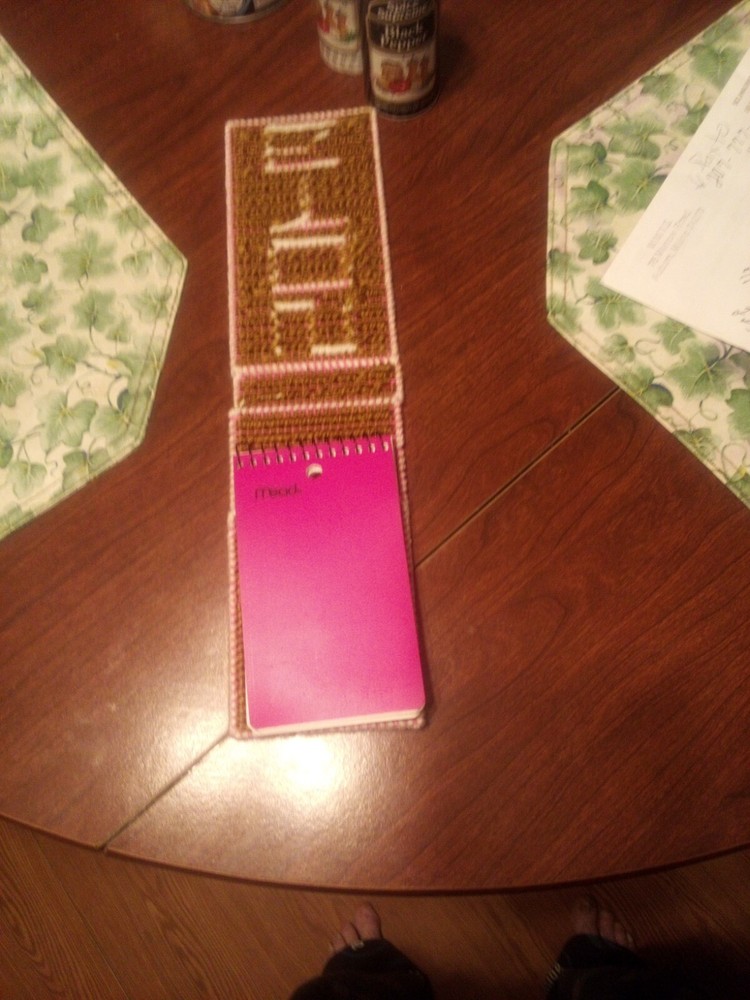Hand Made Small Note Book. This hand made note book. Is made of plastic canvas and yarn it's a great crafted item and great for stocking stuffers could be used for school work. Or office. Could put it in a woman hand bag and and use it for groceries list it's a great idea for notes.