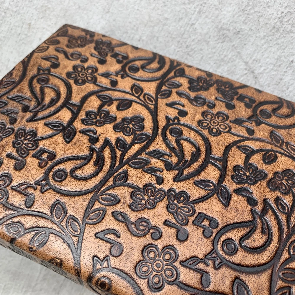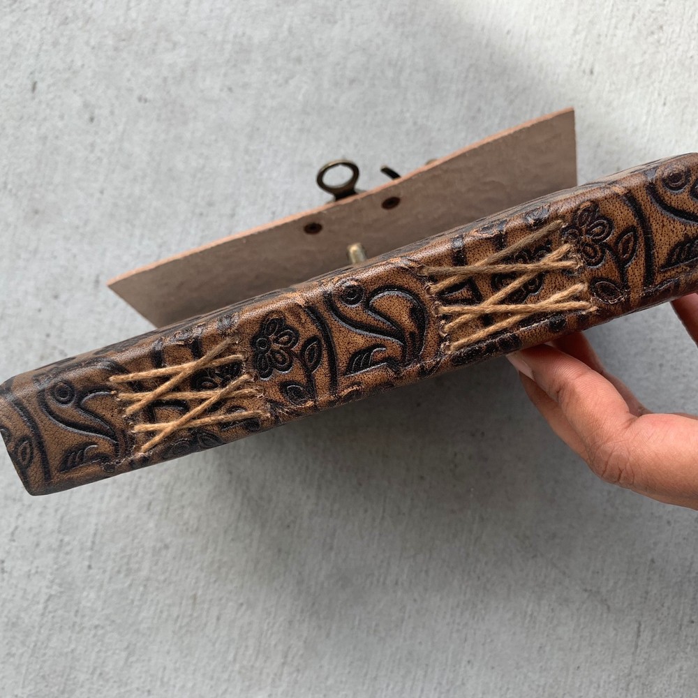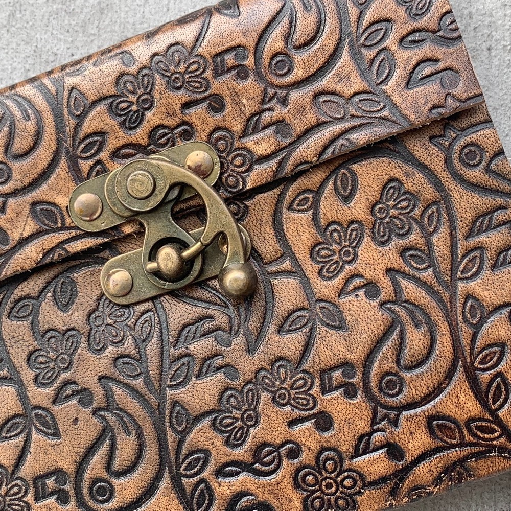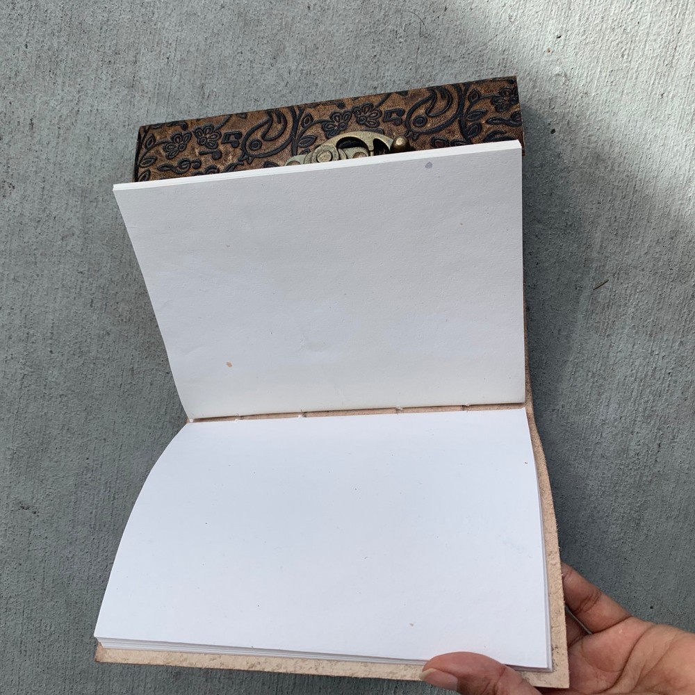 These journals are hand made from leather and hand embossed. The paper is naturally treated cotton paper which are best suited for writing, noting, jotting, sketching, doodling etc. Product Dimensions: Length - 7 in * Width - 5 in - 200 pages approximately Leather used: Bull hide or goat leather Paper Used: SAVE TREES with us - we use eco friendly recycled cotton paper (recycled 100% cotton rag) Since these journals are fully handmade, there could be slight variations in the embossing or sewing or color in every batch *****A little about these journals:******** We were lucky to once find a collection of vintage journals from the 1990's which was handmade and we immediately fell in love with them. Hence we have started to make our own line of journals with our own designs and the latest trendy designs. Each journals is designed and prototyped by me and then the rest of the process is handled by a production partner with help of necessary hand tools Each Journals is fully hand made! We create embossing plates for the designs and those designs are hand embossed on the leather and then they are hand sewn into books. The paper used in these journals are also handmade with cotton. ( Save trees with us as the papers are 100% recycled and handmade) My clients usage: Gifts for him , valentines gift, anniversary or wedding or housewarming gifts, home decor, modern home decor and many more these are ready to ship items and will ship within 1-2 business days. If you are an international customer, then I suggest to upgrade to Priority mail so that you can get the tracking number to track the shipment. PLEASE NOTE: If you wish to purchase more than one item at the same time, please send me a message to request if I could do a combined shipping cost.