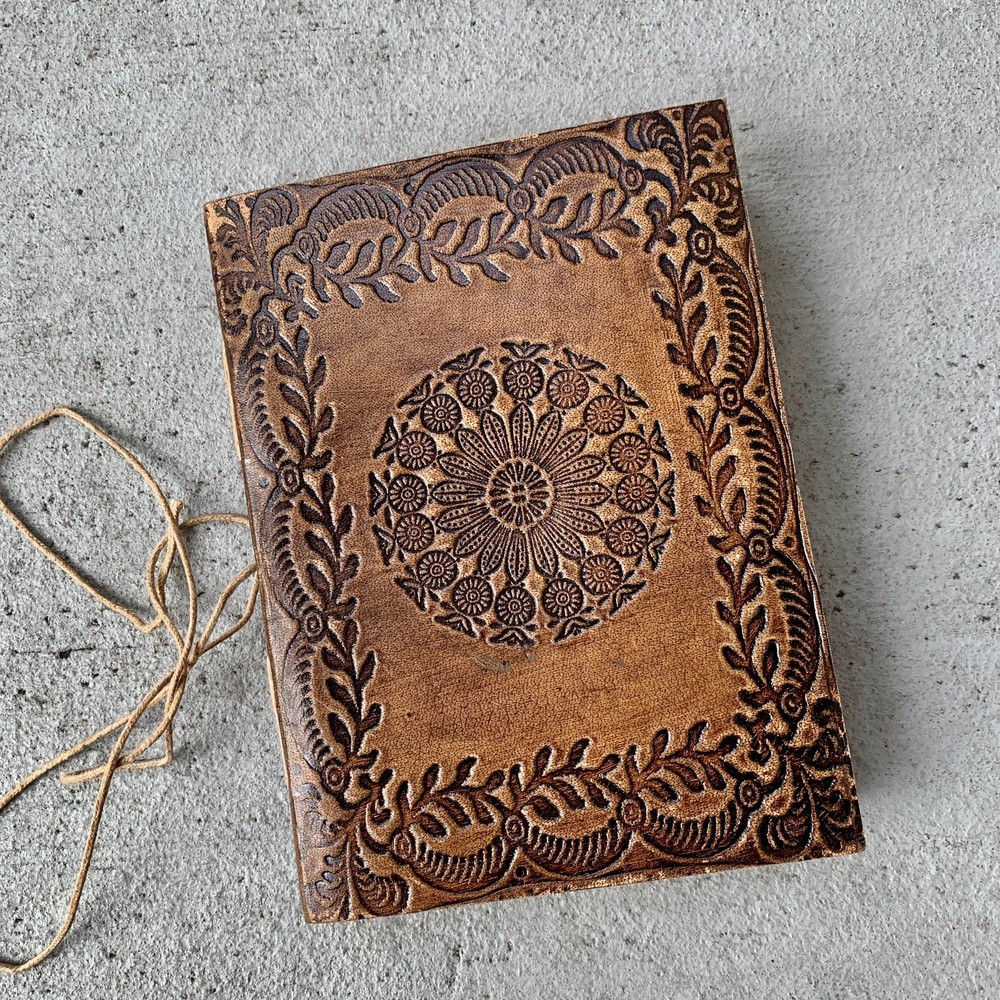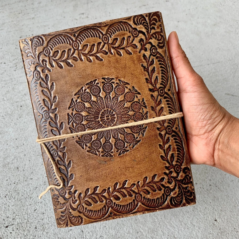 These journals are hand made from leather and hand embossed. The paper is naturally treated cotton paper which are best suited for writing, noting, jotting, sketching, doodling etc. Product Dimensions: Length - 7 in * Width - 5 in - 200 pages approximately Leather used: Bull hide or goat leather Paper Used: SAVE TREES with us - we use eco friendly recycled cotton paper (recycled 100% cotton rag) Since these journals are fully handmade, there could be slight variations in the embossing or sewing or color in every batch *****A little about these journals:******** We were lucky to once find a collection of vintage journals from the 1990's which was handmade and we immediately fell in love with them. Hence we have started to make our own line of journals with our own designs and the latest trendy designs. Each journals is designed and prototyped by me and then the rest of the process is handled by a production partner with help of necessary hand tools Each Journals is fully hand made! We create embossing plates for the designs and those designs are hand embossed on the leather and then they are hand sewn into books. The paper used in these journals are also handmade with cotton. ( Save trees with us as the papers are 100% recycled and handmade) My clients usage: Gifts for him , valentines gift, anniversary or wedding or housewarming gifts, home decor, modern home decor and many more these are ready to ship items and will ship within 1-2 business days. If you are an international customer, then I suggest to upgrade to Priority mail so that you can get the tracking number to track the shipment. PLEASE NOTE: If you wish to purchase more than one item at the same time, please send me a message to request if I could do a combined shipping cost.