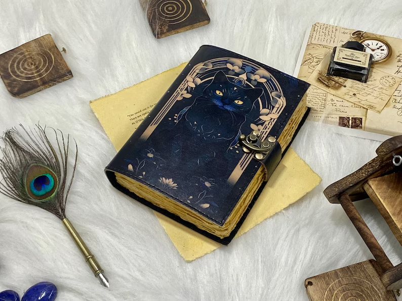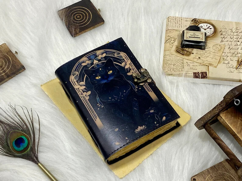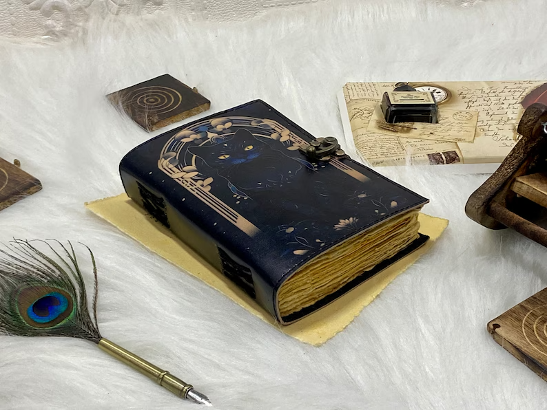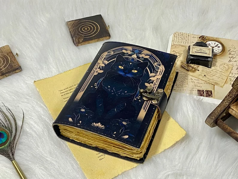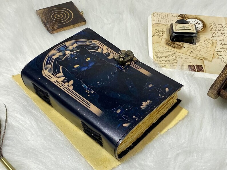 The Handmade Journal Book of Spell with Vintage Leather Celtic Magic Cat is a luxurious and limited edition journal that is personalized and handcrafted in India. Made with high-quality leather, this 1st edition journal features intricate Celtic magic cat designs on its cover, making it a unique and special addition to any collection. Perfect for those looking for a special and magical journal in which to record their thoughts and ideas, this journal is a one-of-a-kind treasure for any individual seeking a distinctive writing experience. • Size - 7×5 inches,8 x 6 inches, 10x7 Inches, 13x10 Inches • Color - • C-Lock • genuine leather • vintage deckle edge old paper • 100 Sheet (200 pages both side) ● Antique Paper - Vintage Journal is made of unique vintage paper which looks like it was pulled from history. You will love the old looking handmade cotton paper (200 pages) which is unique to our vintage journals. ● VINTAGE LOCK AND STURDY BINDING - The vintage lock will keep all your valuable writing locked inside.Sturdy hand stitched binding to make sure that no paper comes out loose from your vintage notebook. ● Sketchbook is great for keeping by the bedside to jot down dreams, or for use as a diary or journal. ● It is a truly unique and wonderful gift for a friend, the men, women, and wiccans in your life! or to treat yourself to as a special keepsake ● our journals are influenced by symbolism that is derived from the Wicca/Pagan community, creating a personalized space where your inner creative genius can flourish. ● The paper is made from sustainable cotton and jute canvas. The paper is acid-free and pH neutral therefore is a timeless piece of art. ● Use Any Kind Of Pen - Sketch, Doodle, Write on your journal notebook with a Calligraphy Pen Fountain Pen, Brush Pen, Ball Pen, Acrylic Colours, Watercolor and many more.