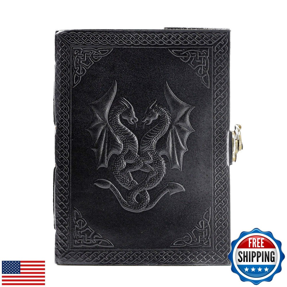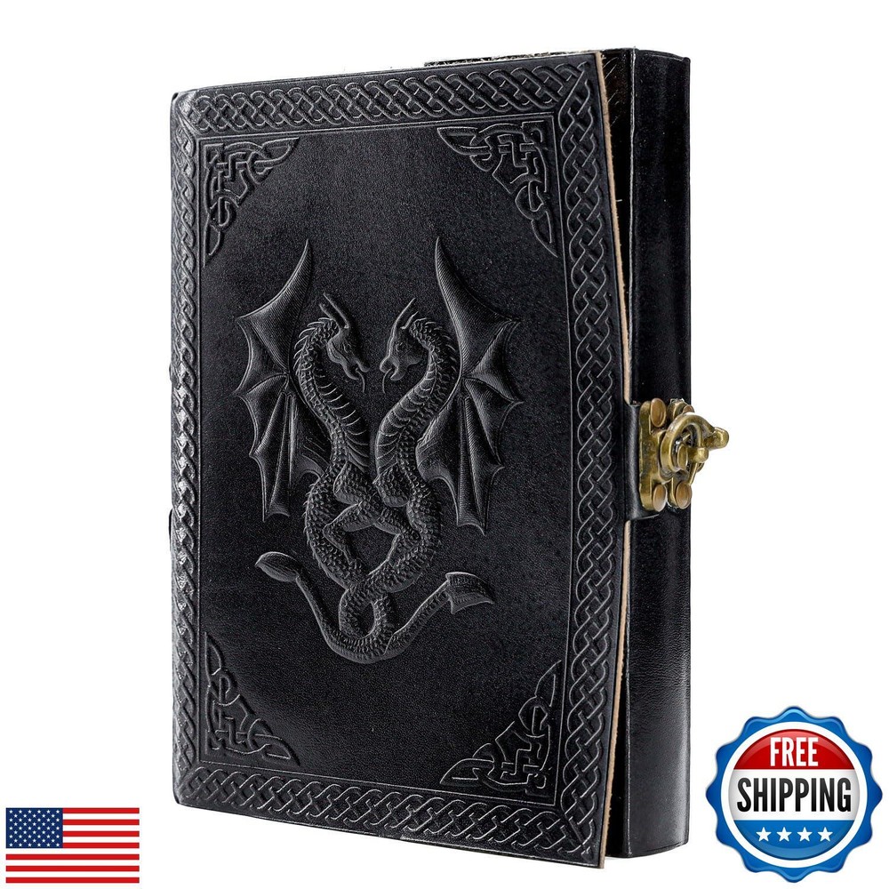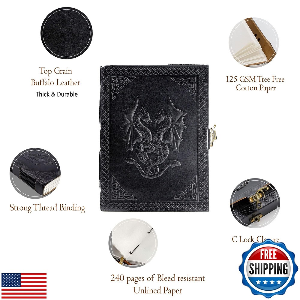 Handmade Leather Double Dragon Journal | Writing Notebook Diary | Bound Daily Notepad for Men and Women Unlined Paper Medium, Writing pad for Artist, Sketch Features HANDCRAFTED FROM TOP GRAIN BUFFALO LEATHER: Each of our journals is handmade by skilled artisans using PREMIUM WATER BUFFALO LEATHER AND RECYCLED COTTON PAPER and features a BEAUTIFULLY CRAFTED DESIGN of Dragon leather cover, Which Makes it perfect for use as a LEATHER NOTEBOOK, SKETCHBOOK, NOTEPAD, DIARY and JOURNAL. PREMIUM MATERIALS, GREAT SIZE: Unlike an average journal that may be filled with low-quality paper that degrades the writing experience. Our Leather journals are made with Premium MATERIALS, Like Top Grain Water Buffalo Leather and PREMIUM 125 gsm EARTH-FRIENDLY PAPER that is perfect to write on. NO BLEED-THROUGH PAGES: BALL PEN AND SLOW FOUNTAIN PEN FRIENDLY. The journal measures 8 inches in height x 6 inches in width x 1.5-inch Thickness TELL YOUR STORY: We designed this classic leather journal for men and women as a time capsule for your thoughts. Capture your important memories, accomplishments, life-changing moments and evolving dreams as a keepsake to reflect upon in years to come. PERFECT GIFT AND COLOR OPTIONS FOR EVERY INDIVIDUAL: Makes an Awesome Anniversary, Valentine's, Christmas, and Birthday Gift. Great gift for women and men, Artists, and travellers. AVAILABLE IN two colours and 2 sizes. OUR 1-YEAR REPLACEMENT WARRANTY: Your purchase is risk-free if by any chance your handmade journal arrives damaged or you find any faults with the craftsmanship, Kindly let us know directly and we will send you a free replacement or a full refund within a year of purchase Shipping Free & Fast Shipping: We offer free shipping to most of the USA with a normal delivery time of 3-7 days. However, due to the current situation, additional delivery time (up to 3 weeks) may be required for some items. Alternative Carriers: We may use alternative carriers (e.g., USPS, FedEx, UPS) to ensure your package arrives safely and on time. Due to the use of multiple carriers, we are unable to provide a tracking number automatically. Handling Time: Orders are processed and shipped within 1-2 business days of receiving cleared payment. Shipping Restrictions: Shipping to Alaska, Hawaii, Puerto Rico, Guam, and other US territories may incur shipping charges or delivery restrictions. Please contact us before ordering, or your order can be refunded/cancelled. State Restrictions: Certain items may not be shipped to California due to state regulations. Contact for Tracking Updates: If you require tracking updates or have any concerns about the delivery of your order, please feel free to contact us, and we will be happy to assist you. Return Policy 30-Day Hassle-Free Returns: If you are not completely satisfied with your purchase, you can return the item for free within 30 days of receiving it for a full refund or exchange. Easy Return Process: Contact us, and we will provide you with a prepaid return shipping label and detailed instructions. No Restocking Fee: There are no restocking fees for returns. However, the buyer is responsible for return shipping costs if the return is not due to a seller's error. Refund Processing: Refunds will be processed within 1 business day of receiving the returned item in its original condition. Payment We accept all major credit cards, PayPal, and Apple Pay for your convenience. Your payment information is secure and encrypted to ensure a safe and seamless transaction. Please complete your payment within 3 days of purchase to avoid any delays in shipping. Feedback Your feedback is extremely important to us. We strive to provide the best products and customer service possible. If you are satisfied with your purchase, please take a moment to leave us a positive review. If you have any concerns or issues with your order, please contact us before leaving negative feedback. We are committed to resolving any problems and ensuring your satisfaction. Contact Us If you have any questions or concerns, please feel free to reach out to our customer support team. You can contact us through the eBay messaging system. We are available Monday to Friday, 9:00 am to 5:00 pm EST, and we will do our best to respond to your inquiry within 24 hours. Thank you for supporting our small family business!