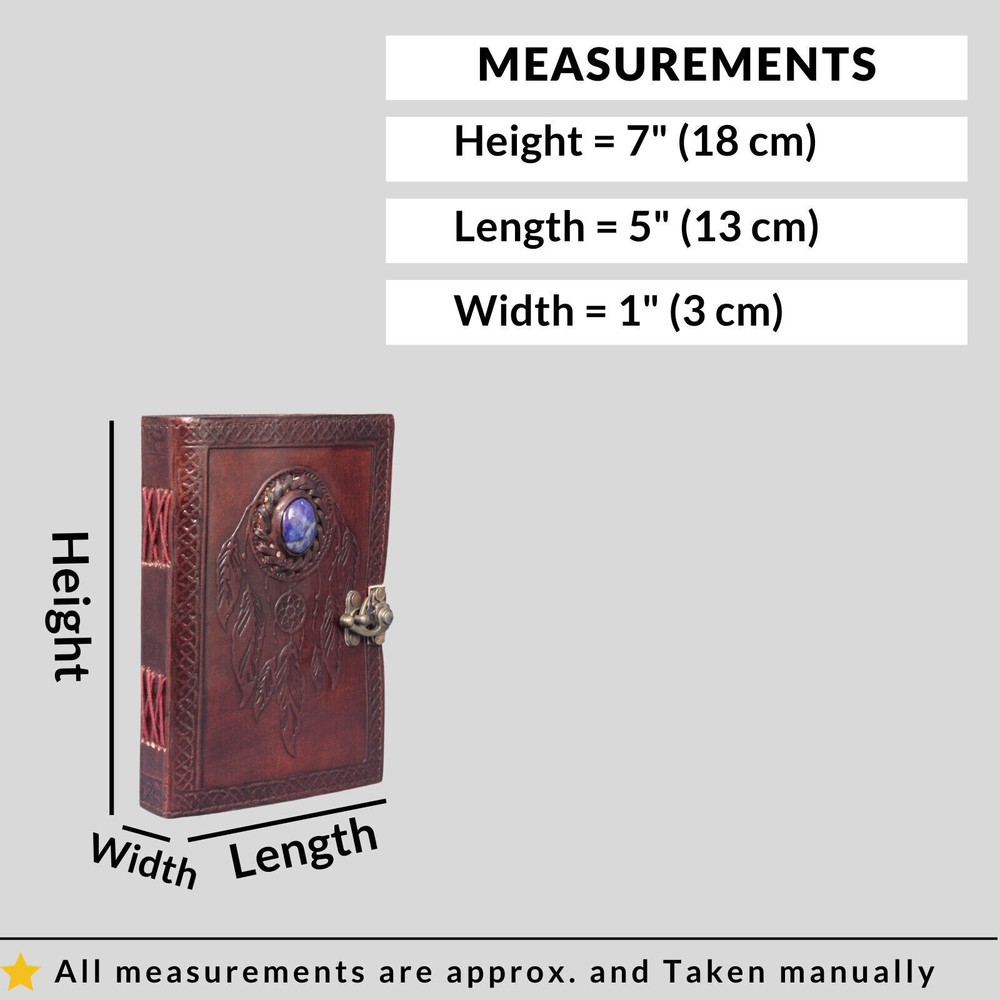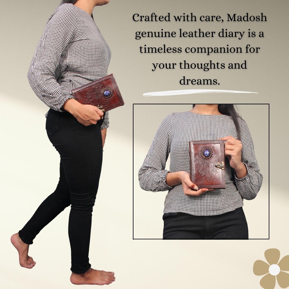 Welcome To MADOSH (Brand: Madosh- Mad Over ShoppingTM) Step into a realm of mythical wonders with our Dragons and Stone Leather Journal, a masterpiece that blends the power of twin dragons with the mystique of ancient stones. Crafted from genuine leather with an intricate design featuring twin dragons and enchanting stones, this journal showcases the skill of artisan craftsmanship. This is more than a notebook. It's a versatile diary and planner that goes wherever you go. Use it as an appointment book, daily journal, sketchbook, or travel diary to get the most out of your day. Designed for the modern storyteller, this compact journal is ready to accompany you on your daily quests. The Clasp closure adds a touch of fantasy and ensures the security of your innermost thoughts, just like the dragons guarding their treasures and the stones holding ancient secrets. Size: Height:8" (20 cm) | Length: 6" (15 cm) | Width: 3” (8 cm). Features: Genuine leather Clasp closure 100 sheets (200 pages) Country of origin: India Note: 100% Genuine leather diary. Paper used in diary are 100% recycled cotton acid free paper. It is handmade and made by professional artisans.