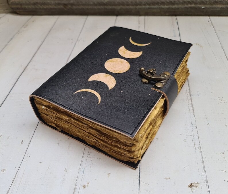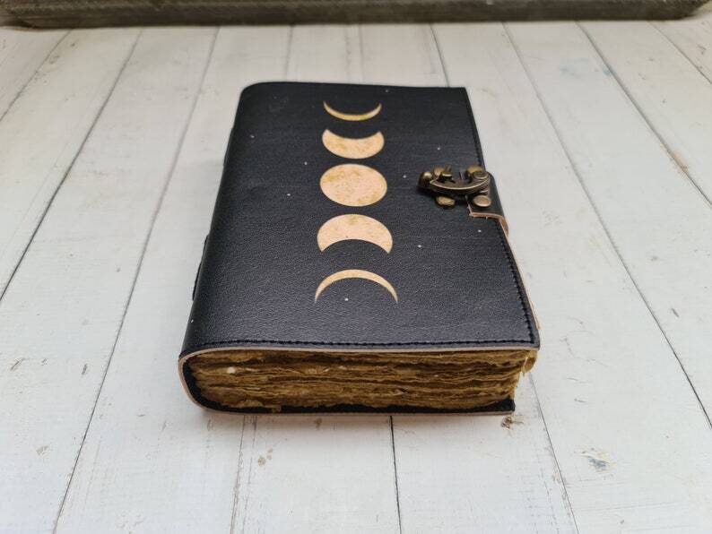 Beautifully adorned with the powerful symbolism of the moon phases. Handcrafted with love and care, this journal is a sacred space for witches, spiritual seekers, and anyone attuned to the lunar energies of the universe Triple moon Goddess color printed journal • Triple moon print • C-Lock brass • Genuine buffalo leather • Vintage look deckle edge old paper ↪ Size - 7x5 Inches, 8x6 Inches, 10x7 Inches • Soft Luxurious Durable and Supple Rustic Leather Bound Cover which ages with time. • Thick Antique Vintage Cotton Paper which looks like thousand years old. • Sturdy Leather Binding Technique will make sure that the pages never fall off. Moon Phases Print Blank Spell Book, Book of Shadows, Vintage Leather Journal Gift for Him & Her