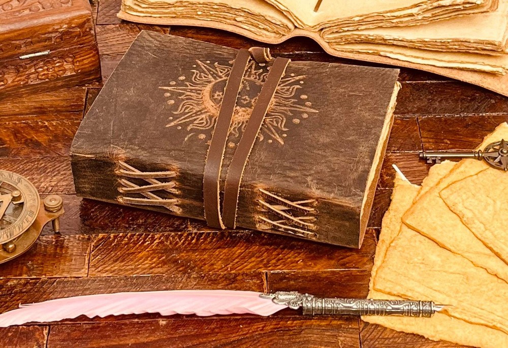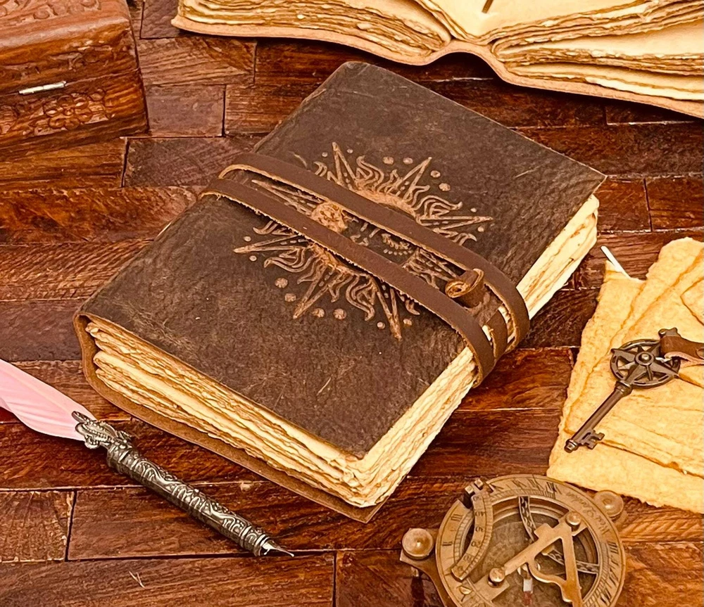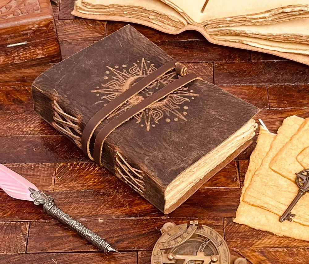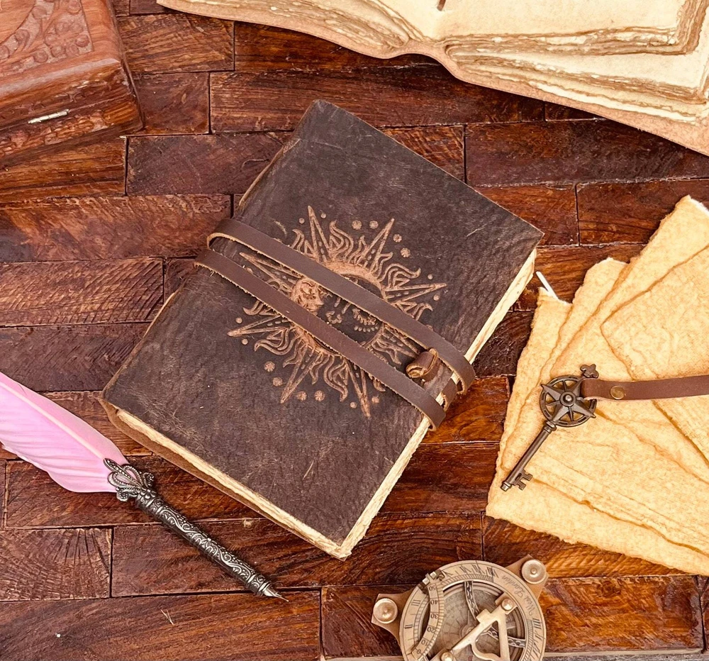 This handmade journal features intricate designs of a sun and moon on its antique vintage leather cover. Perfect for both men and women, it contains blank pages for jotting down notes, ideas, and thoughts. Its special attributes include being a 1st edition, while its country of origin is India. With its versatility, this journal is suitable for use as a business and industrial tool, in the office, or as an office supply. Whether used as a planner, a diary, or for creative writing, this leather journal is bound to be an asset to any collection. PAYONEER I accept Payoneer. COUNTRY: Shipping Worldwide from INDIA TYPE: Standard Int'l Flat Rate Shipping OTHER: I usually ship within 24 hours after receipt of payment. The delivery time from Ukraine: 10-25 days. Item will be qualitatively packed. Always leave a positive feedback to good ebayers. 30-Day return policy : I guarantee you complete satisfaction with all my high quality products. If you receive an item you did not order or if an item you ordered is received damaged or defective, I will refund you the price you paid for it or replace it with identical one.