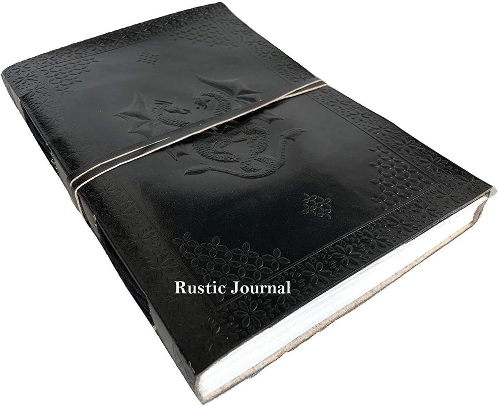 Product Description We are a small team of energetic souls who are passionate about handcrafted leather products and accessories. We believe that our stunning leather products enhance the joys of today's ultra-modern lifestyle by complementing it. That’s why we are not just creating leather, we are creating life, formed after undergoing many changes to become an amazing product – a rustic collectible. We champion the cause to encourage the traditional technique of producing leather bags. The bag is skillfully handcrafted by our artisans who have learned this art from old generations in their close-knit families. They cut, paste and stitch the bag themselves using traditional tools. The bag thus produced is not “perfect” as compared to factory made stuff – but it is these imperfections that make our journals look actually “perfect” to the discerning eye. Beautiful Handcrafted Journals This luxurious antique leather notebook is 100% handcrafted with care every step of the way to ensure it’s a leather journal to treasure for men, women, students, journalists or travelers of all ages. Each hand made journal is truly unique so no two are exactly the same. This journal makes a lovely keepsake. This lovely leather journal is not refillable - offers a valuable, fun and collectible way to keep your ideas alive forever! Treat yourself to this lovely journal or mesmerize your loved ones. This distinctive embossed journal will help you store memories for lifetime. Antique Multi Purpose Daily Notepad/Bullet Journal Artists Sketchbooks, Poetry Work Instagram Photo-book, Scrapbook Album Boys Girls & Teen Diaries Notebook Travel Diary/Thought Book Appointments Reminders Recipe Book Hunting log Book Bible Journalism Food Planner Organizer Front Cover has Stunning handmade Double Dragon embossed depicting Strength. Back Cover also has an antique style design handcrafted by skilled artisans. Premium Quality Leather Designs Best Gift for Loved Ones This large leather journal is an effective means of expression for writers, artists, students, office goers, serious journalists, and casual doodlers to capture thoughts, moments, sketches, and notes while at home, work, school or on the go, this journal is sure to be your indispensable companion. Unique embossing design on cover makes it a charming souvenir and gift for men, women, students, travelers of all ages. A unique gift or a Party Favor for all occasion Christmas, Birthdays, Anniversary, Halloween, Mother's Day, Father's Day, Teacher;s Day, Black Friday or any special event to Friends & Family If you are looking for an artisan journal with a touch of the past that will make a great travel companion and the perfect gift, then order yours today. Become Creative & Experience Less Stress With This Leather Bound Writing Journal! Handmade From Genuine Leather All round Features Dimensions: 10 x 7 x 1.5 Inches. perfect size for handbag and schoolbag, compact for carrying in bag. Genuine vintage Leather cover with hand stitched leather binding which secure the pages firmly. The leather wrap around strap effectively carry on your journal closed, also acts as a handy look. The leather wrap around strap effectively carry on your journal closed, also acts as a handy look. Strongly Bound with Traditional Stitching Methods Strong bindings keep the pages firmly bound to enjoy any type of Journalism, Writing or for any Creative purpose. Our Loveliest relationships are with our notebooks – those trusty places to scribble big ideas, little reminders and anything that inspires you throughout the day. This journal contains perfect number of pages, not too bulky, so its easy to write in from the very first page. Non Bleeding Papers Handmade papers from recycled cotton biomass is Chemical free & Tree Free and thus is Environment Friendly. Rich Quality Papers has no Bleed through, so any type of pen, pencil, charcoal or even paint can be used on these paper. This retro vintage journal contains 180 pages. All pages are handmade and recycled which gives compliment to the nice brown soft leather.