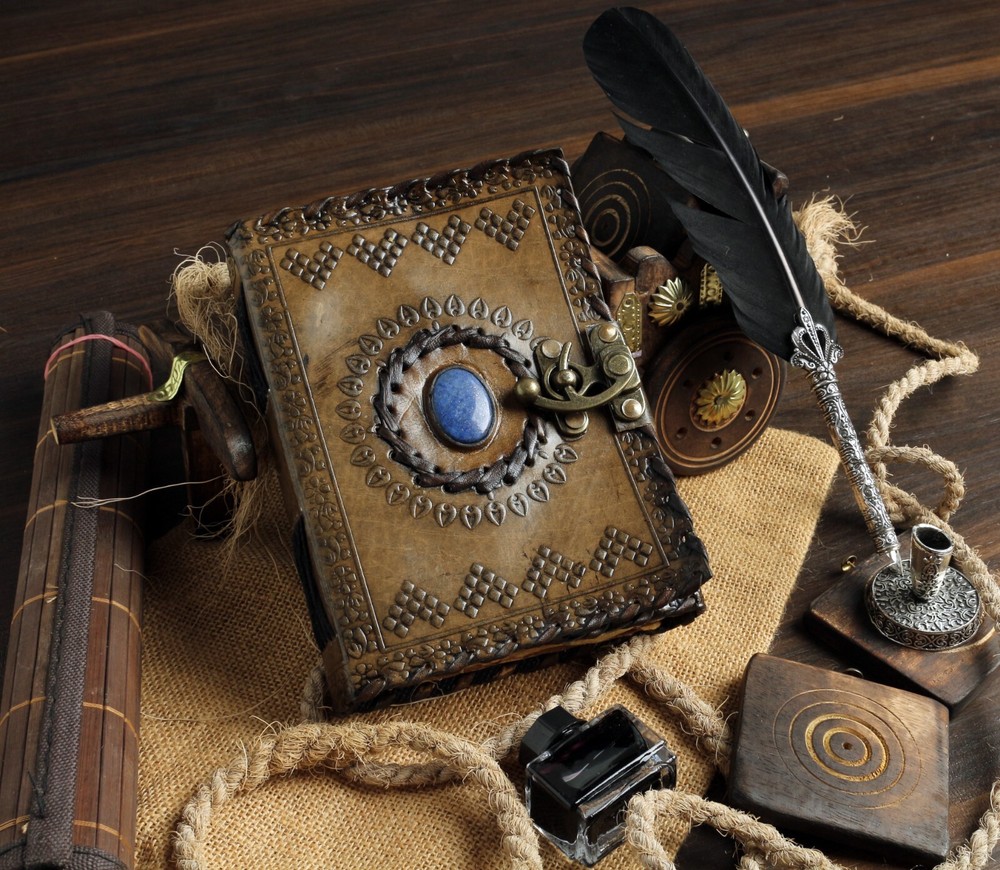 UNIQUE HANDMADE VINTAGE PAPER - Vintage Journal is made with 200 pages of Antique Paper which looks like it was pulled from history. You will fall in love with the the antique handmade cotton paper which is unique to our Vintage Journal Notebook. EXQUISITE & UNIQUE WITCH SEVEN STONE : The vintage journal is antique color embossed with a special stone called “lapis lazuli” which helps to reveal inner truth within yourself and encourage self-awareness and self expression. We have taken extra to make sure that the emboss is perfect in every piece. VINTAGE LOCK AND STURDY BINDING - The vintage lock will keep all your valuable writing locked inside. Sturdy hand stitched binding to make sure that no paper comes out loose from your vintage notebook. USE ANY KIND OF PEN - Sketch, Doodle, Write on your Leather Bound Journal with a Calligraphy Pen Fountain Pen, Brush Pen, Ball Pen, Acrylic Colours, Watercolor and many more. We guarantee no bleed through. MANY USES - Can be used as a notepad, journal, writing notebook, sketch book. 1.25 inch thickness, easy for handwriting, drawing or sketching and compact for carrying in your bag. Ideal for alternative Artist Sketchbooks, Photo Album, Traveling Notes, Business Executive, Logbook, Poetry Work, Journalists, Food Planner, Instagram Scrapbook and Bible Journaling.