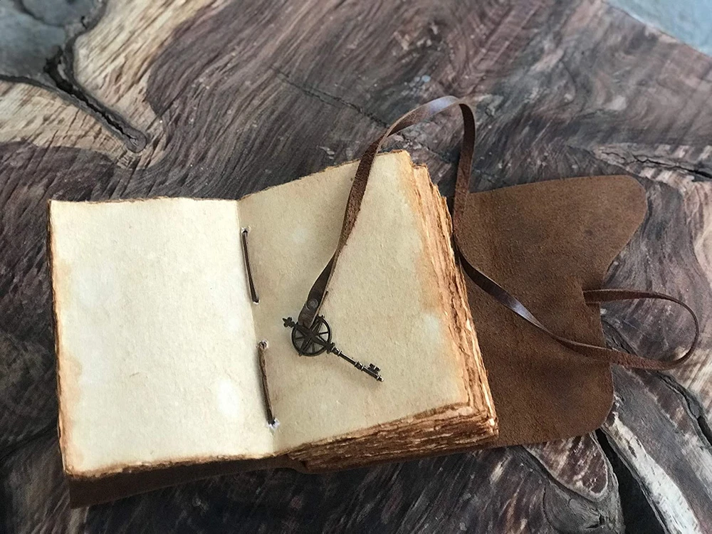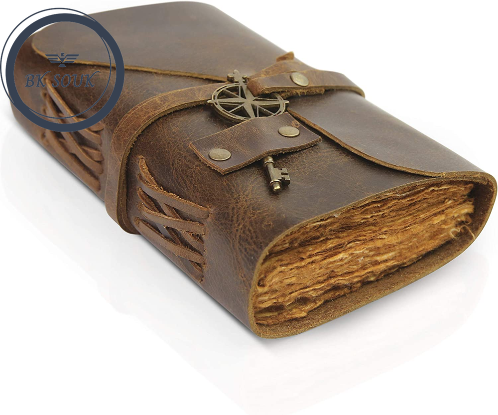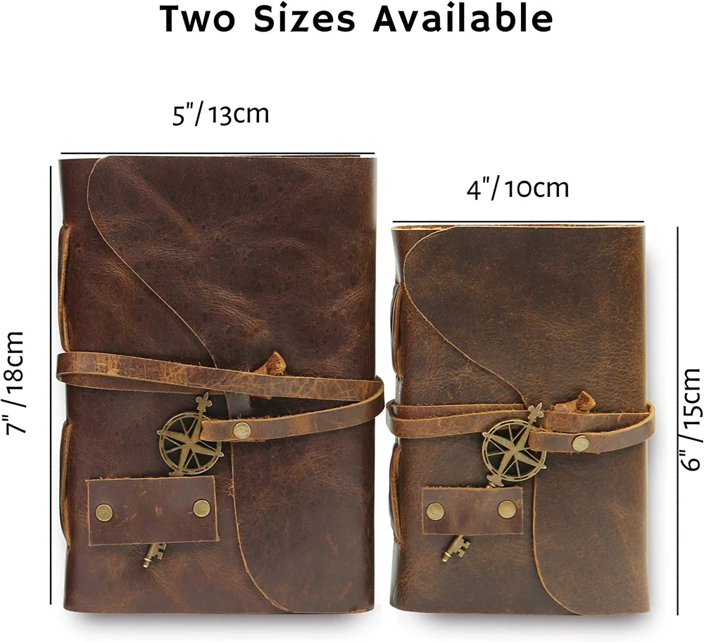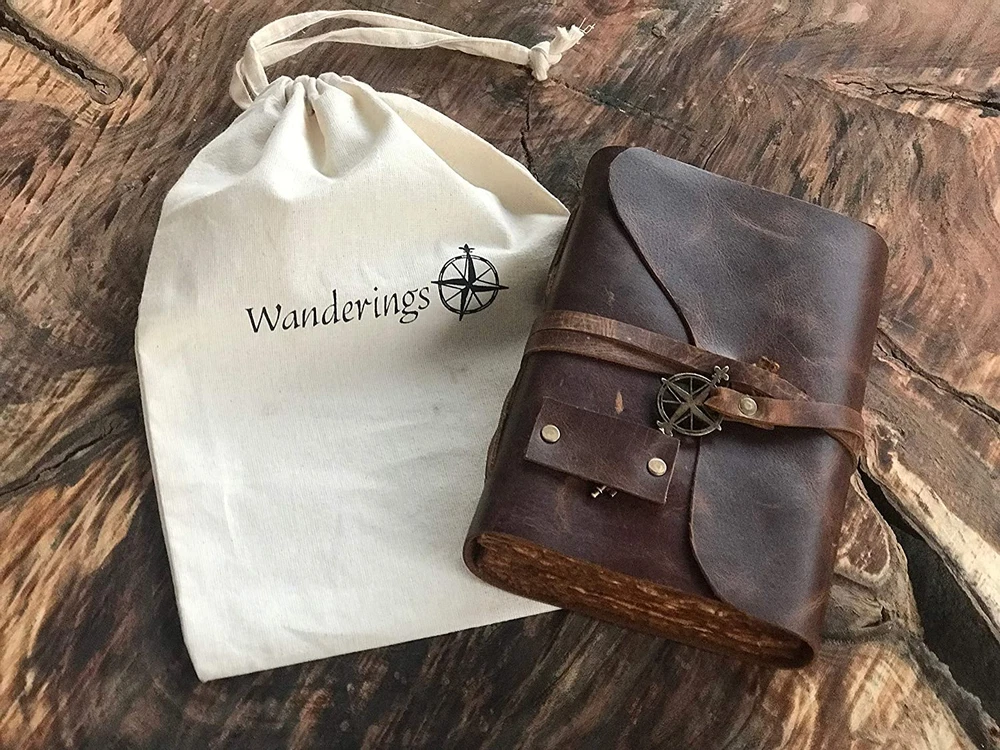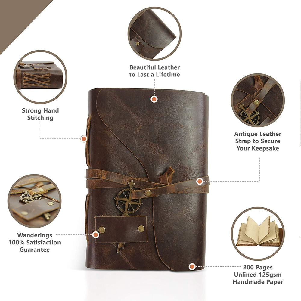 ✔️ BEAUTIFULLY HANDCRAFTED High quality, thick, full grain 100% leather notebook that looks, smells and feels beautiful. Naturally tanned buffalo leather will age with character - a lifelong keepsake for your thoughts and expressions. ✔️ HANDMADE PAPER - DECKLE EDGE Vintage Paper - 200 pages of off-white, 125gsm recycled cotton that is acid-free, chemical-free and tree-free. This gorgeous, thick, BLANK unlined paper prevents bleed-through and feels amazing. ENVIRONMENTALLY SENSITIVE. ✔️ ️SMALL and COMPACT - Escape with your Wanderings leather bound journal and create your own adventure. Makes a great leather writing notebook, diary journal, or watercolor pad. Write, dream, draw, or even cast a spell - create your own story. SMALL 4x6" and 200 pages / 100 sheets (NON-REFILLABLE) is the perfect size rustic journal and a makes great travel companion. ✔️ STYLISHLY ANCIENT - Old fashioned cotton paper combined with the beauty of a distressed leather , hand stitched by Artisans, creates a keepsake you will cherish forever. Makes a great gift for the men, women, and wiccans in your life! ✔️ Also available on Amazon in Lined (B09753XBQV), Burnt Pages (B0979VRRSP), and Gift Box (B07YSXC8YG). ✔️ 𝐎𝐔𝐑 𝐆𝐔𝐀𝐑𝐀𝐍𝐓𝐄𝐄: If for any reason you don’t love our Wanderings antique leather journals please let us know and we’ll send you a refund - no questions asked. It is as simple as that! Product Description Handcrafted by Artisans BEAUTIFULLY HANDCRAFTED High-quality full-grain 100% leather that looks, smells, and feels beautiful. Naturally tanned leather will age with character - or simply rub away your markings if you choose. A lifelong companion on your journeys. Four sizes to choose from. Three Styles of Deckle Edge Three styles of DECKLE EDGE Vintage Paper available. Choose from: Vintage Old Fashioned Aged Unlined Vintage Old Fashioned Aged Lined Ivory / White Perfect for creating your masterpiece or logging those pieces of everyday wisdom Handmade Paper Handmade Vintage Paper - 200 sheets of thick 120gsm recycled cotton that is: acid-free chemical-free tree-free This gorgeous, thick, BLANK paper prevents bleed-through and feels amazing. ENVIRONMENTALLY SENSITIVE and fountain pen friendly. Wanderings Quality OUR PROMISE : If for any reason you don’t love our Wanderings antique leather journals please let us know and we’ll make it right - no questions asked. Create Your Own Adventure TIMELESS - Escape with Wanderings and create your own creative masterpiece. Write, sketch, doodle, or draw, the options have no limits. Create Your Own Adventure TIMELESS - Escape with Wanderings and create your own masterpiece. Write, sketch, doodle or draw, the options have no limits. Create Your Own Adventure TIMELESS - Escape with Wanderings and create your own masterpiece. Write, sketch, doodle or draw, the options have no limits. Create Your Own Adventure TIMELESS - Escape with Wanderings and create your own masterpiece. Write, sketch, doodle or draw, the options have no limits. Dream Draw Create Write STYLISHLY ANCIENT - Antique cotton paper combined with the beauty of distressed leather, hand-stitched by Artisans, creates a keepsake you will cherish forever. Makes a great gift for the men, women, and wiccans in your life! Genuine Leather Wanderings Quality Handmade Deckle Edge Paper Timeless Design