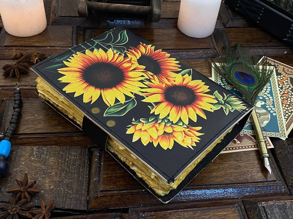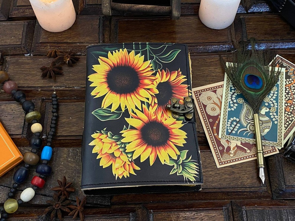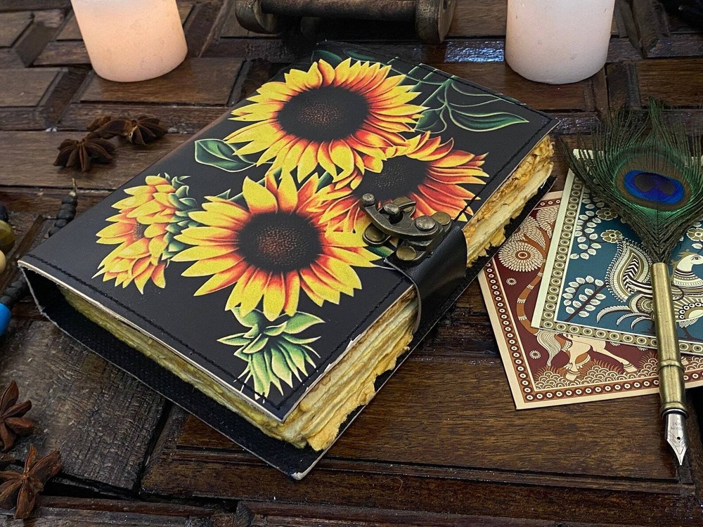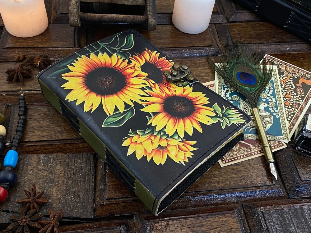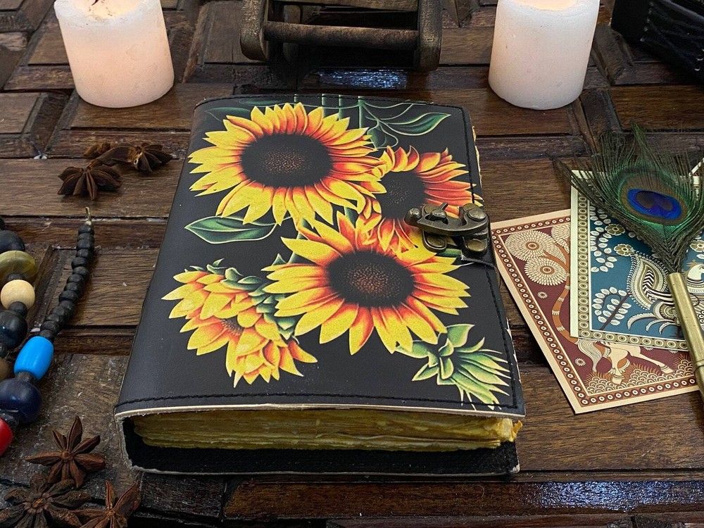 Sun Flower Leather Journal Notepads Book of Shadows Journal for Women Writing Journal, Travel Journal, Handmade deckle Edge paper With Lock • Print - Sun Flower • Vintage lock closure • Genuine buffalo leather • Vintage deckle edge old paper • handmade rustic cotton paper • Size - 7×5 inches,8 x 6 inches, 10x7 Inches You will fall in love with the the antique handmade cotton paper which is unique to our Vintage Journal Notebook. The vintage clasp lock will keep all your valuable writing locked inside. Study hand stitched binding to make sure that no paper comes out loose from your spell notebook. Artist Sketchbooks, Photo Album, Traveling Notes, Business Executive, Logbook, Poetry Work, Journalists, Food Planner, instagram Scrapbook and Bible Journaling. The vintage clasp lock will keep all your valuable writing locked inside. Leather notebook, leather journal, leather grimoire, book of shadows, gift for him, gift for her, gift for boyfriend, gift for girlfriend, gift for mother, wiccan, pagan, recipe notebook, travel notebook, wedding guest book.