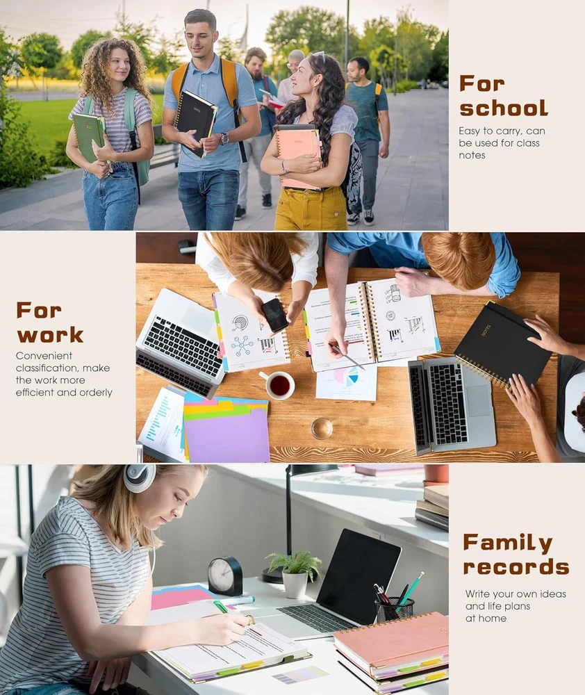 Store New Arrivals Add to Favorite View Feedback Contact Hardcover Spiral Notebook Journal with Removable Dividers Tabs, 300 Pages Leather 5 Subject Notebook College Ruled, 100GMS A5 Notebooks for Work School Note Taking,Lined Journal for Women,A5-Black Description Item model number ZtbjbA5-HEI Package Dimensions 8.31 x 6.77 x 1.46 inches Sheet Size A5 Color Black Binding Unknown Binding Manufacturer Part Number ZtbjbA5-HEI Pages 300 Pages Item Weight 1.34 pounds Ruling Ruled Ruling Type Ruled Cover Material Leather Size 6.2"x8.6" 【Leather Hardcover Spiral Notebook】Premium leather combine cardboard constituted a sturdy waterproof cover, prevent coffee、water from wetting the inner pages and against the notebook tabs /pages from bending, while 4 golden metal-corners and thick twin- spiral binding, further protect your important meeting records or work school note well. A kind side pen loop design, which reduce the frequency that losing pens. 【5 Adjustable Dividers with 8 Tabs】Our 5 subject notebook include 5 removable plastic dividers, flexible and durable so you can move and organize them as your wish. It can be divided into 5 sections in total, which had enough features to keep organized on different subjects, instead of piles of random spiral notebooks that will slimmed your backpack down a ton! Come with 8 self-adhesive labels that separate information and make it easy to find categories to help organize your notes effectively. 【300 Pages Thick Notebook】A5 size notebook 6.2"x8.6"compact and exquisite with 300 pages /150 sheet for long-term storage will reduce the amount of notebooks you buy! Acid-free light Ivory paper that protect your eyes. High-quality 100GSM thick page create smoother writing process and prevent ink bleeding through or ghosting. 7.1mm college ruled spiral notebook and the top of each page are sections for“Weather”,“Week”,“Memo No” and “Date” to meet your daily note writing needs. 【Easy Writing at 180°Lay Flat】Thick twin-spiral binding less likely to fall apart and easy to turn the pages to ensures that the notebook lays flat when open,making writing a breeze even for left handed writers. Elastic closure band keep your spiral journal secure when closed and can also be used as a bookmark to keep track where you wrote. An expandable back pocket that is great for storing extra notes, cards, or other important items. 【Hardcover Notebooks for Work School】This spiral 5 subject notebooks is an excellent choice for students, professionals, or anyone who like to write things down and needs to keep them organized. A stylish look with gold color stamp font, binding brighten up your dreary desk, also a wonderful gift to work organization, back to school or family records. Product Description The leather 5 subject notebook you've been looking for!! 5 Subject notebooks for people who like to write things down and needs to keep them organized Premium leather combined with cardboard cover is thick and waterproof to protect the inner paper and tabs from bending and getting wet 4 Round metal corner prevent you from accidentally being scratched during daily use, while reducing the wear of notebook and adding aesthetic appeal. Tight elastic strap keeps it closed in you backpack and won't make a mess of the paper, meanwhile it can also be used as a bookmark to hold the current page when writing notes. Side elastic pen holder can hold a variety of pen sizes, no more forgetting to bring a pen and educe the frequency of losing pens Gold-stamp font with simple spiral notebook design adding an elegant and classic touch This hardcover spiral notebook has a wide range of applications. You can use it as basic meeting records, study records, travel diary records, etc. It is also a good choice as a gift for friends, family and colleagues. 5 Subject Notebook with 5 removable divider and 8 self-adhesive tabs 5 colored removable dividers with 8 self-adhesive tabs, you can mark each section by name with 8 stickers, organizing different topics instead of multiple random notebooks 100 GSM no bleed through withstand most of daliy pen,thick ivory paper provides no bleeding through, no smearing, no ghosting or no feathering writing experience for you. 180° lays flat provides a comfortable writing experience, whether you are left or right-handed. It can even be fold 360° to frees up desktop space 7.1mm college ruled applies to most notes, give you enough space to write. Worried about paper getting wet? The surface of our notebook cover is made of waterproof leather, which prevents the inner paper from being soiled by water or coffee, further protects your precious notes. The hard, thick cardboard inside provides great support when you're writing Different subjects require different thickness? Movable dividers allow to adjust the pages to suit the length of the notes, and the PVC plastic materials are easy to clean and durable to withstand daily flip over Worried about paper falling? Metal material holds the paper tightly like a pair of big hands, no more worry about pages fall apart The Twin-ring binding provides enough space for smooth page turns Helpful inner pocket An expand inner pocket help to storage for miscellaneous items such as cards, note pads, etc. 300 Pages B5 size spiral notebook for school work The sturdy leather cover is designed to be 0.7in wider than the paper, effective protecting the divider label from bending 300 pages thick notebook, enough to meet the needs of long-term use, and the spiral binding makes it easy to tear out pages without disturbing the rest of the notebook It can be evenly divided into 60 pages,or move the dividers adjust the subject page as you need ABOUT US We offer the best prices around on high quality products. Our E-store includes media such as books, movies, music and games while offering electronics, toys, sporting apparel, clothing, tools, general home, garden items and more. SHIPPING We are always working hard to ensu