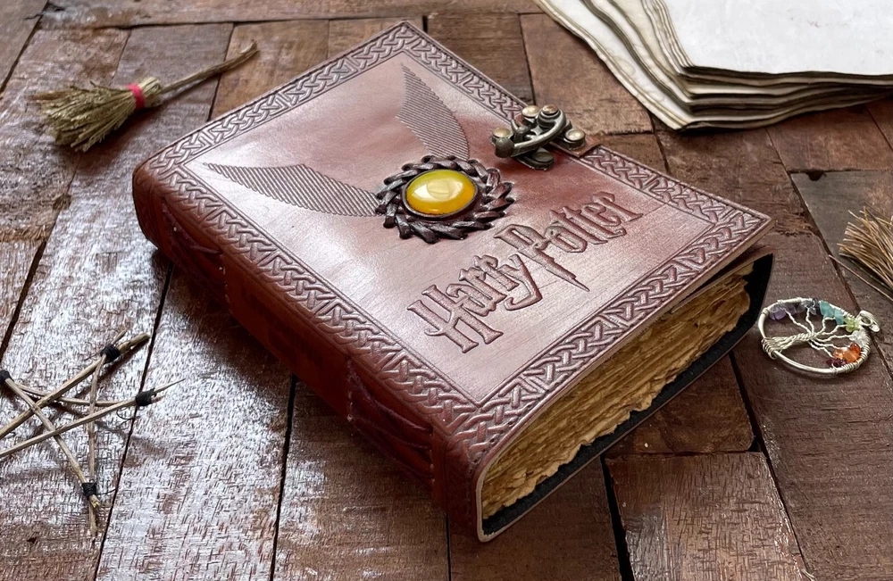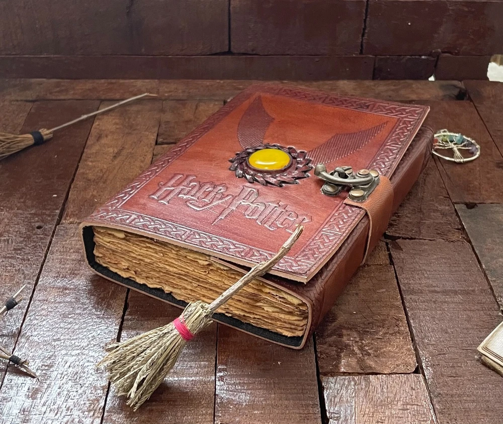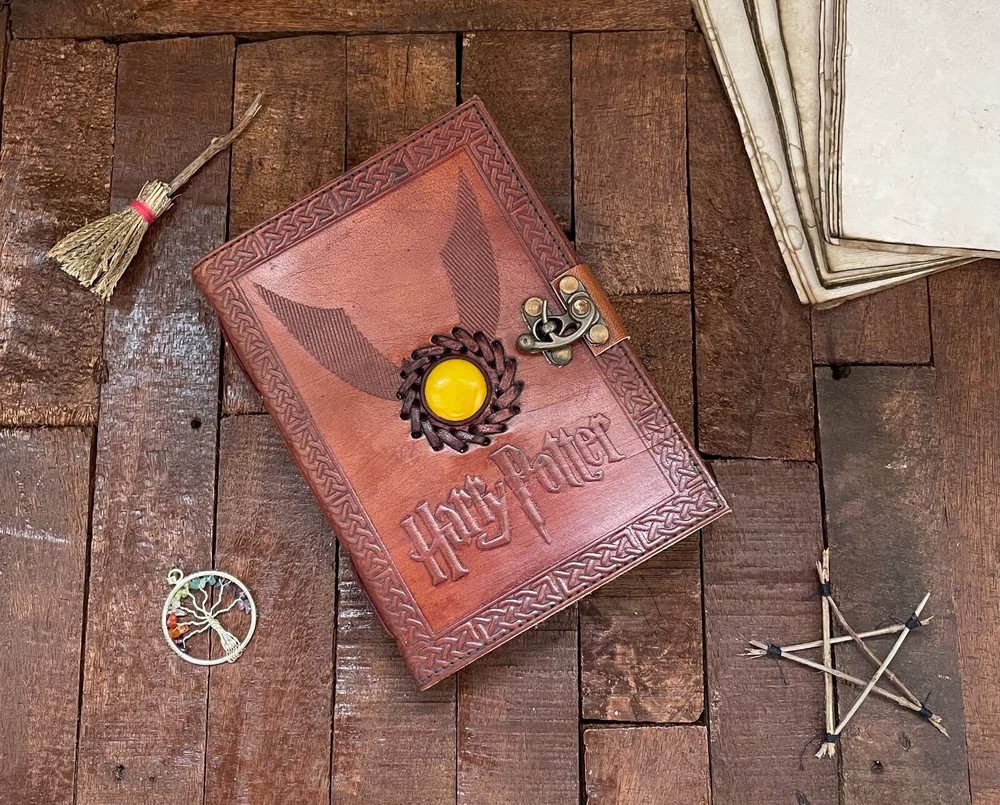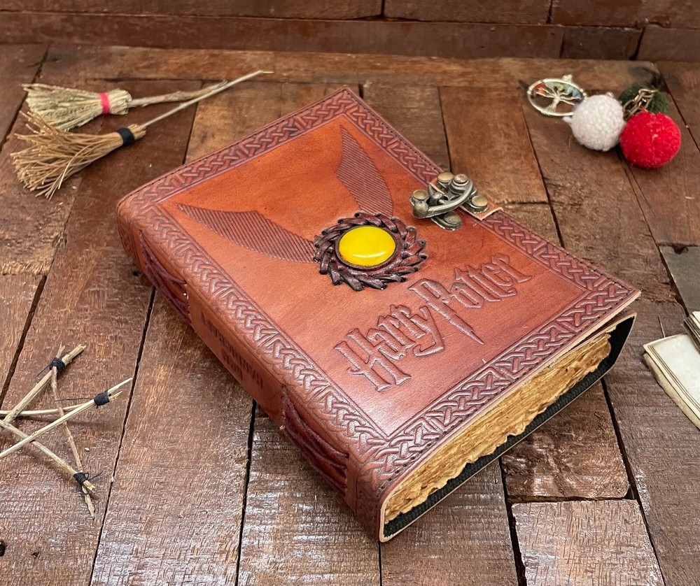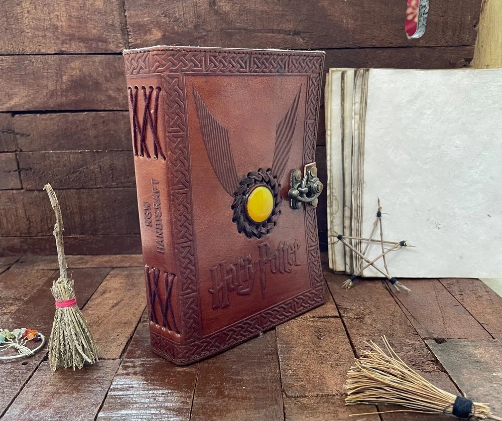 Harry Potter Embossed Brown Cover with Yellow Moonstone Leather Journal, Wizard Gifts Magic Book Genuine Vintage Deckle Edge Grimoire Pages Item description from the seller JOURNAL FOR WOMEN : A perfect Leather Journal for Women by The Udaipur Art . This Vintage Journal is made from Genuine leather which is naturally tanned with oils, Salt & Scents and is Chrome free. These Girls Journals are made with genuine leather so each vary in look and shade producing a unique item. The Distress Leather combined with Antique Vintage paper makes it a perfect Book of shadows - Spell Book. VINTAGE LEATHER JOURNAL: This Old Journal comes with a Beautiful Lock Closer. This Leather Notebook makes a Unique Gift for Women - Teen Girls. Use this Blank Journal as a Travel journal, Daily journal, Gratitude Journal, pregnancy journal, Bible Journal, Prayer Journal, Wedding Guest Book Alternative etc. JOURNAL NOTEBOOKS WITH IDEAL SIZE : - This Gratitude Journal comes with Four sizes 13 inches X 10 inches, 10 inches X 7 inches, 8 inches X 6 inches, 7 inches X 5 inches. Easy for handwriting, drawing and sketching and compact for carrying in your bag. USE ANY KIND OF PEN; sketch, doodle on your blank Journal with a Calligraphy Pen, Fountain Pen, Brush.