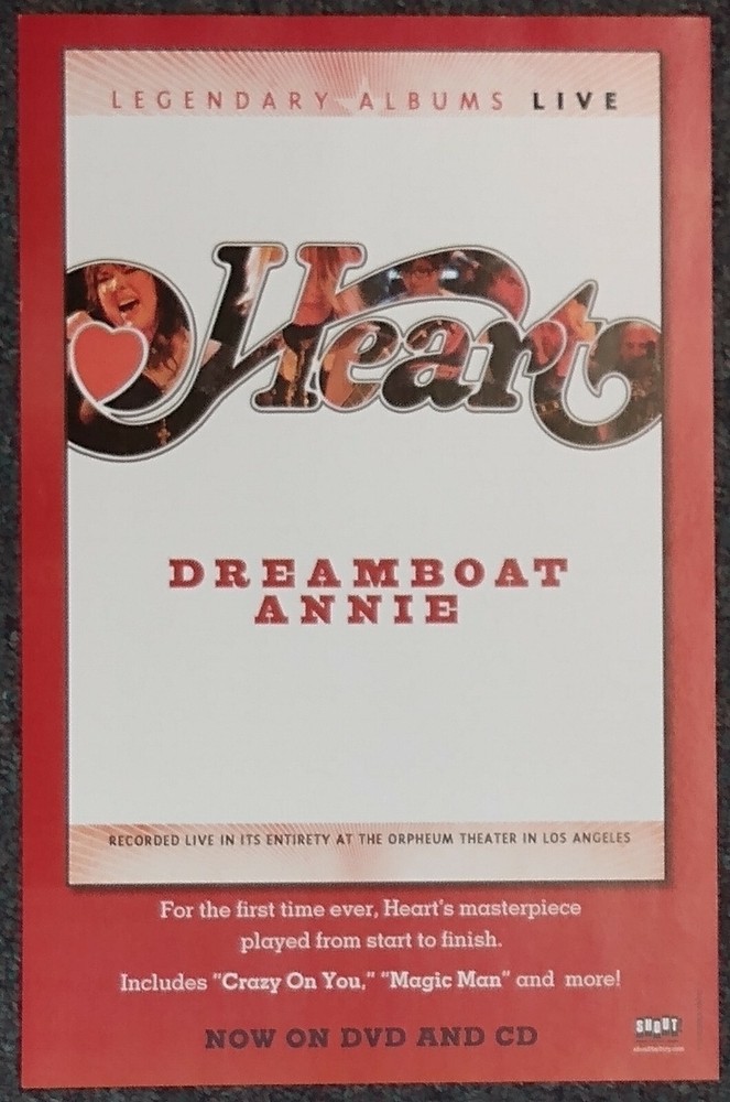 Heart Dreamboat Annie Live 2007 PROMO POSTER Heart ~ Dreamboat Annie Live Recorded Live at the Orpheum Theater in Los Angeles Shout! Factory Promotional Poster from 2007 17" x 11" Excellent condition COMBINED SHIPPING AVAILABLE WITH PURCHASE OF MULTIPLE ITEMS