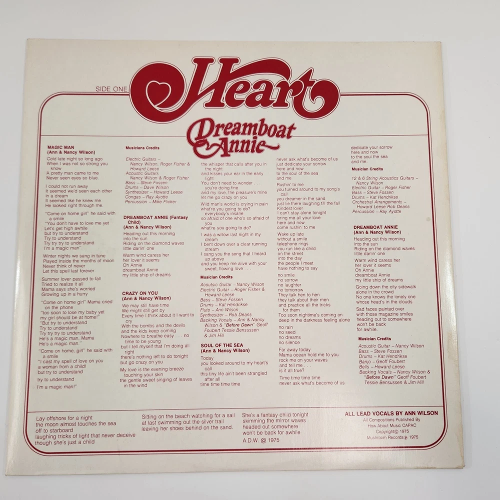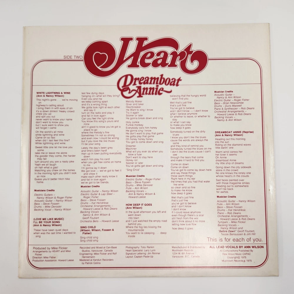Heart "Dreamboat Annie" vinyl record by Mushroom Records, 1975. Record is in VG+ condition, while the sleeve is split and is in G condition. Please review photos closely for further details. PLEASE NOTE: Records are visually inspected only, not tested on a record player. We are not professional graders. SHIPPING : YES - we combine shipping. Add as many items to your cart as you like! YES - we ship fast! Your order will be on its way to you within 2 business days of cleared payment. Taxes & Duty: Canadian buyers will be c ha rged GST, HST or PST (based on your province of residence) on top of your purchases. We do not charge tax on shipping, only on the item purchased. US buyers : Don't worry about duty! There are no import duties or customs charges unless your order is valued at more than $800 USD. International buyers : Import duties, taxes, and charges are not included in the item price or shipping cost. These charges are the buyer's responsibility. P lease check with your country's customs office to determine what these additional costs will be prior to bidding or buying. Returns : We accept returns only within 30 days of shipping date. We do our best to describe any flaws and give as much detail as possible on all items, however all items are sold as is. Buyer pays return shipping. About Storage Warrior : We've been rescuing awesome stuff from storage lockers, estate sales and about-to-be-thrown-out collections since 2012. We love putting cool stuff in the hands of people who will love it, and keeping history out of the landfill. We hope you enjoy shopping with us!