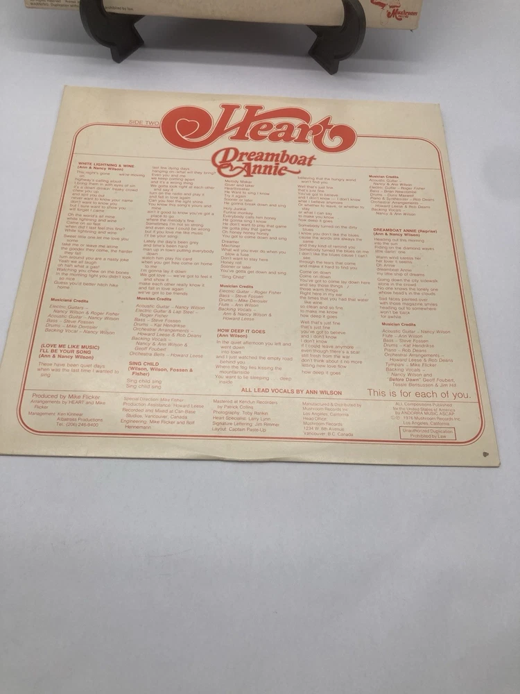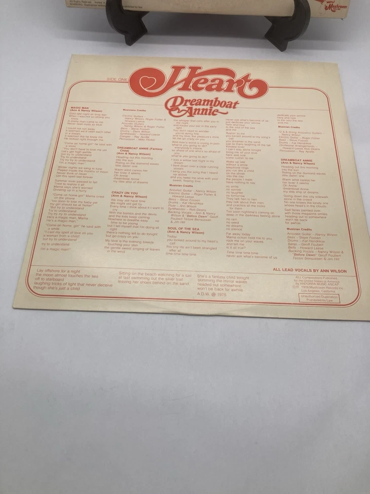 Embark on a nostalgic journey with Heart's iconic "Dreamboat Annie" LP, a classic rock gem released by Mushroom Records in 1975. The album, wrapped in its original cover and gatefold, takes you back to the era of bold rock anthems with its standout hits. Preserved on high-quality vinyl, this record promises an auditory experience true to its era, with a 33 RPM speed that brings the band's energy to life. The vinyl and sleeve maintain a remarkable track record, graded as Excellent (EX) and Good Plus (G+), respectively, indicating careful handling over the years. Complete with the original inner sleeve, this LP is not just a listening pleasure but a collectible piece for enthusiasts of classic 1970s rock. The Terre Haute Press edition with catalog number MRS-5005 is a must-have for the discerning music connoisseur.