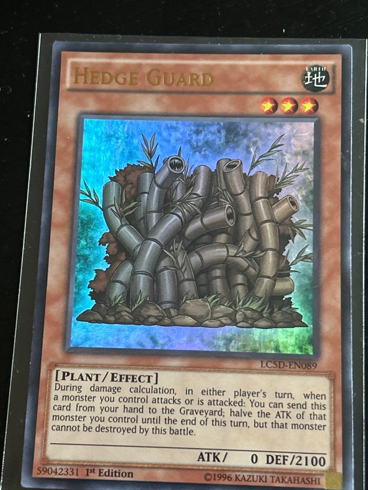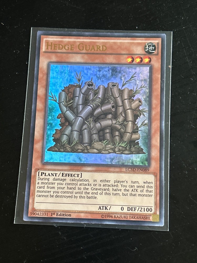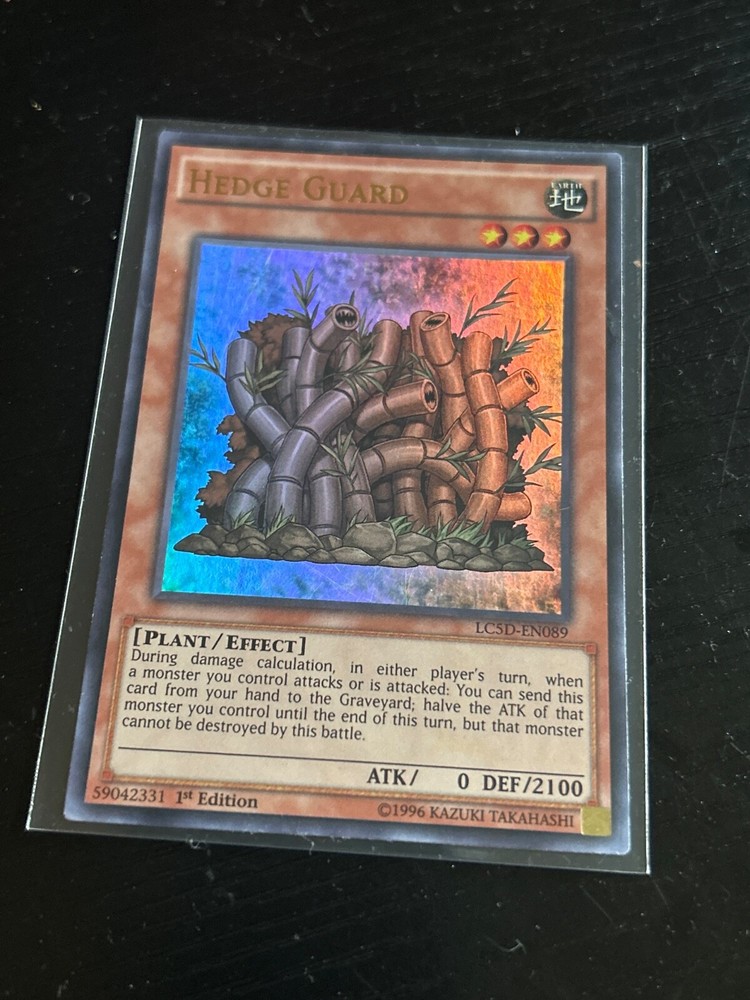 This ultra rare Hedge Guard card from the Legendary Collection 5D's set is a must-have for any Yu-Gi-Oh! TCG collector. With a defense/toughness of 2100 and an attack/power of 0, this plant-type creature is sure to bring a hedge to your opponent's defense. The card is in English and manufactured by Konami, featuring 1st edition technology. The card number is LC5D-EN089 and it is an effect type card with no rarity designation. Whether you're a seasoned collector or just starting out, this card is a valuable addition to your collection. Don't miss your chance to own this rare and powerful card.