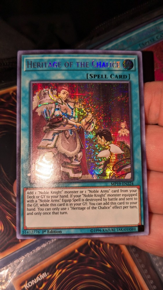 This rare and highly sought-after card is a must-have for any Yu-Gi-Oh! TCG collector. It is a 1st edition spell-normal card named "Heritage of the Chalice" with a prismatic secret rare rarity level. The card is from the 2019 Gold Sarcophagus Tin Mega Pack set and has the card number MP19-EN224. The card is in English language and manufactured by Konami. It is an excellent addition to any collection and is sure to impress fellow collectors. Get your hands on this unique card today!