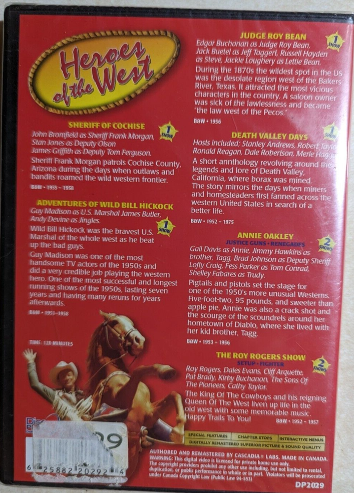This DVD features 8 classic western movies, all in NTSC format and contained in a Tall/DVD case. The films star Roy Rogers and cover various sub-genres such as Adventures of Wild Bill Hickock and Annie Oakley. The studio behind this edition is Disc Plaza and the release year is 2004. The language of the films is English and the features include Judge Roy Bean, Black & White, Full Screen, Sheriff of Cochise, The Roy Rogers Show, Death Valley Days, and Annie Oakley. This DVD is formatted for Region Code DVD: 1 (US, Canada...) and has a rating of NR. It is a perfect addition to any Western movie collection. See item specifics and pics for more details. We can combine shipping with other DVD's in our store. Orders placed before 2 pm cst are usually shipped the same day. Item is shipped in reinforced packaging for safe delivery.