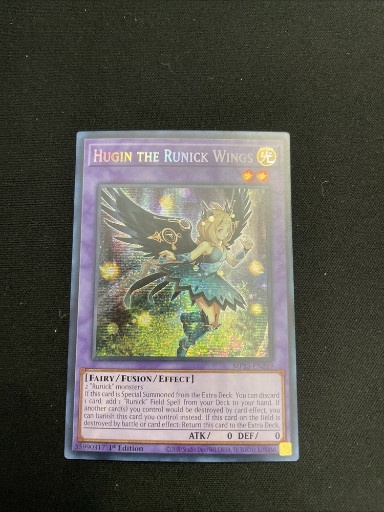 This is a rare and special edition Hugin the Runick Wings card from the Yu-Gi-Oh! TCG. It is a Prismatic Secret Rare card from the 25th Anniversary Tin: Dueling Heroes Mega Pack. The card is in English and has an attack power of 0 and a defense toughness of 0. It is an Effect Fusion card with a card number of MP23-EN249. The card is manufactured by Konami and is a 1st Edition.