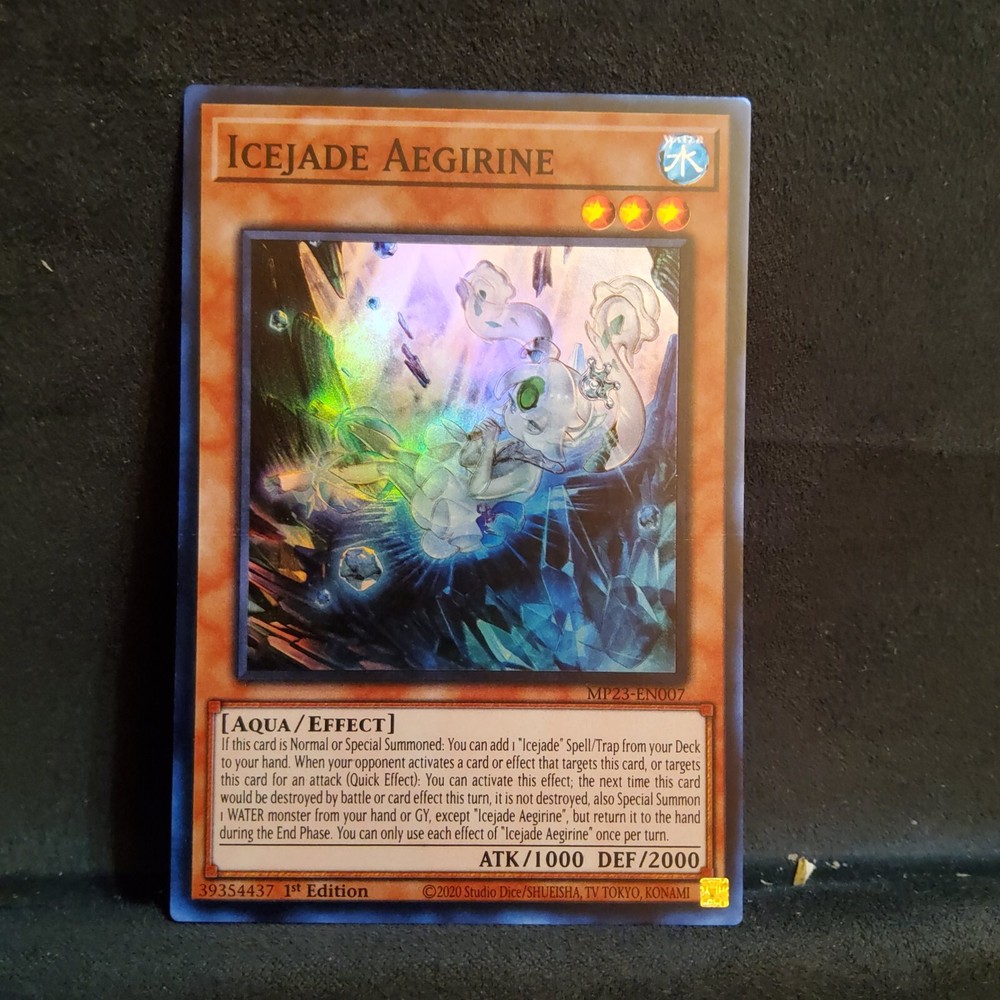 Icejade Aegirine is a Super Rare Yu-Gi-Oh! TCG card from the 25th Anniversary Tin: Dueling Heroes Mega Pack. It belongs to the Attribute "Water" and Monster Type "Aqua", with 1000 Attack and 2000 Defense. The card is in 1st Edition English and has an Effect ability. Its card number is MP23-EN007.