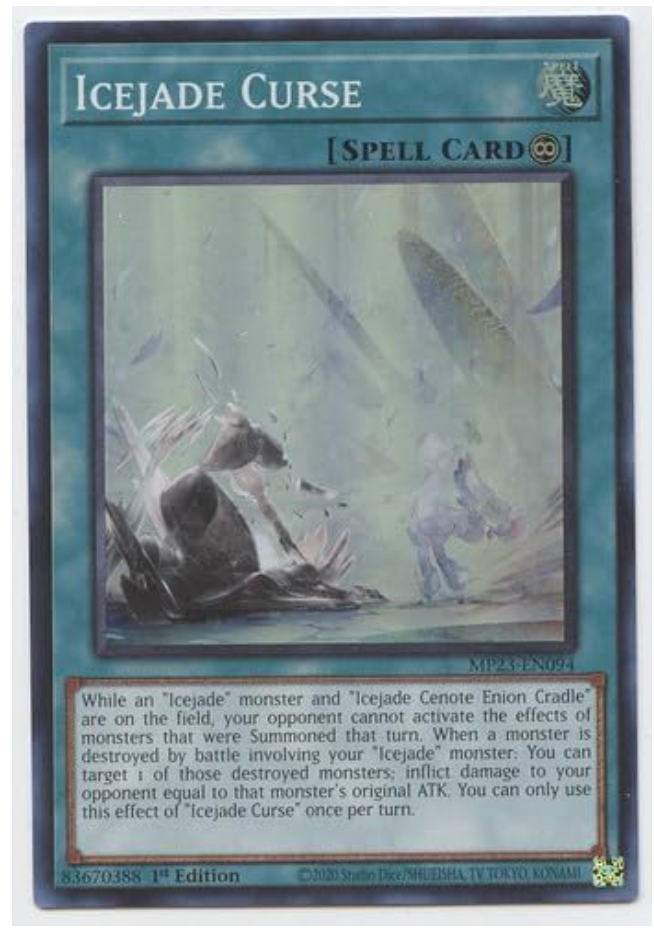 The 🔥Icejade Curse MP23-EN094 25th Anniversary Tin: Dueling Heroes Mega Pack 1st🔥 card is a Super Rare card from the Yu-Gi-Oh! TCG set released by Konami. This Spell-Continuous card features an English language version of the Icejade Curse, a Hero-type creature. As a 1st Edition card, it holds a special collector's value for fans of the game looking to enhance their decks with unique cards like this one.